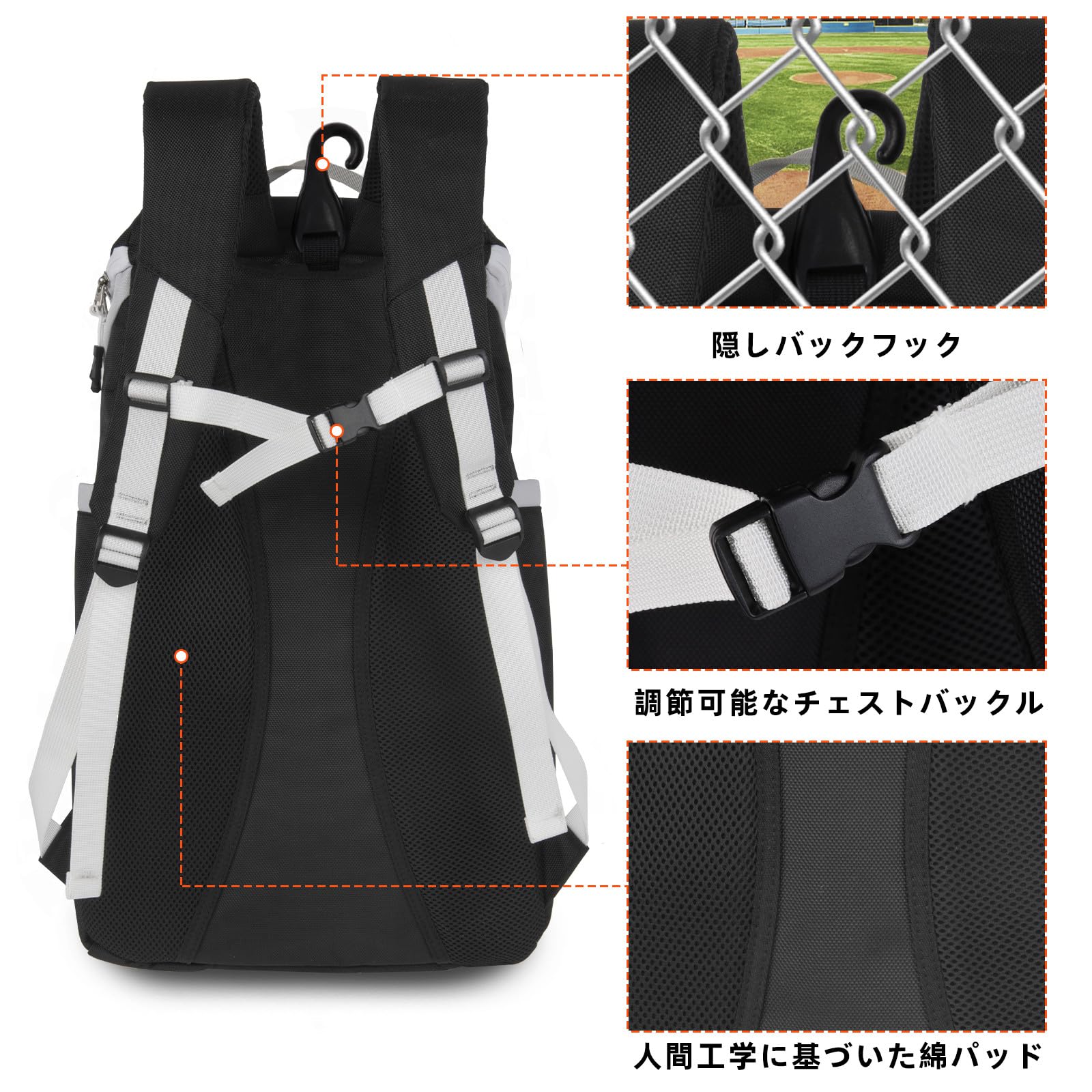 【優れたデザイン】①外部ヘルメットホルダー付き!野球ヘルメットをバッグの外側に収納できます。野球用具や日用品を収納できるスペースが広がります。②底部にある隔離換気された靴コンパートメントは、靴を他のアイテムから分離します。③OPOALOの野球リュックには、隠しフェンスフックが付き、スポーツをするとき、バックパックを自由にフェンスなどに吊るすことができます。④ショルダーベルトの部分にアジャスターバックル付き、チェストベルトの設計で、背負う時、肩からずり落ちるという悩みを解消し、両手を解放できます。それに、より安定してリュックを身体に固定することが出来ます。⑤強化されたクッション性と耐衝撃性のある背面、6mmのパッドが付きウエストサポートです。より一層身体に負担をかけるのを軽減します。