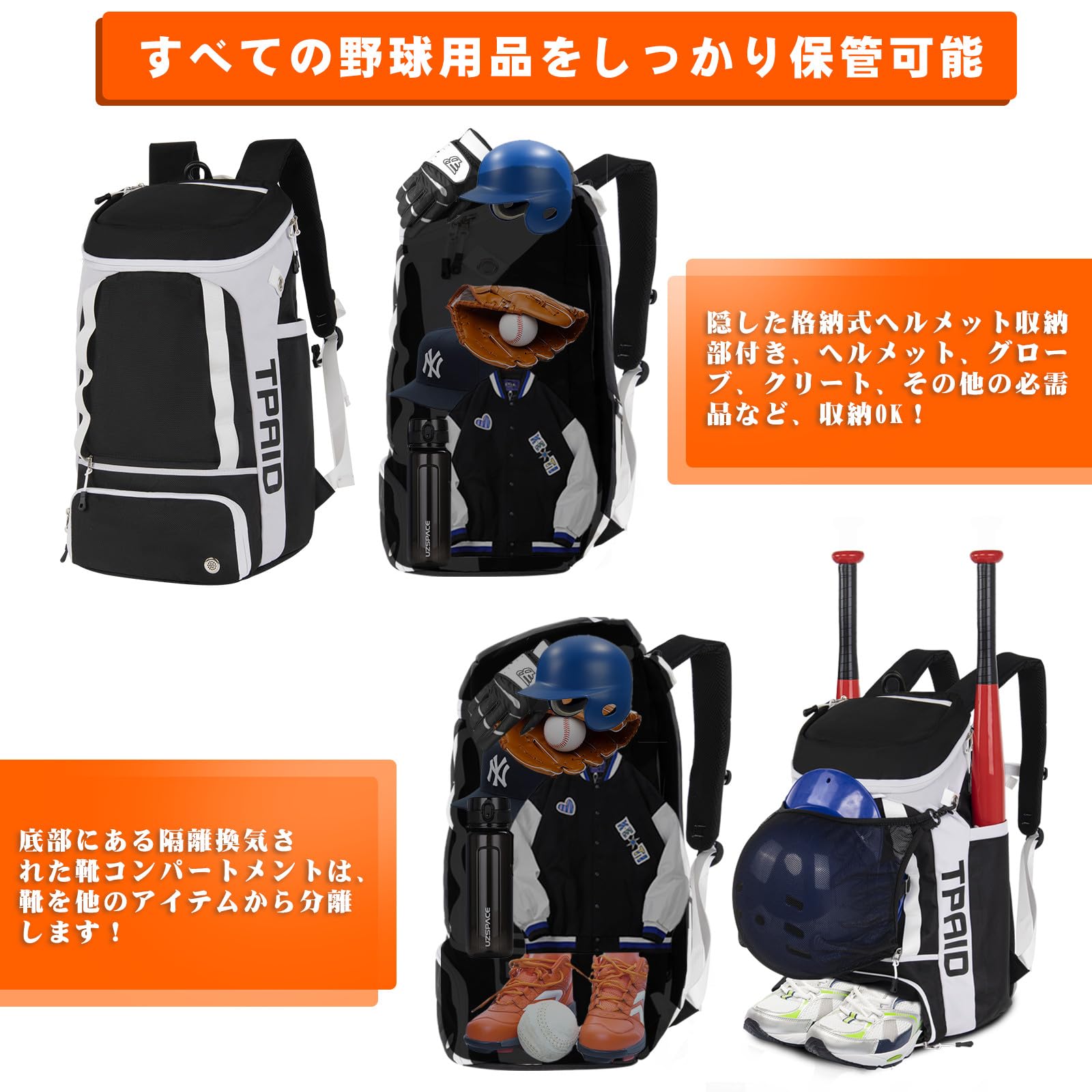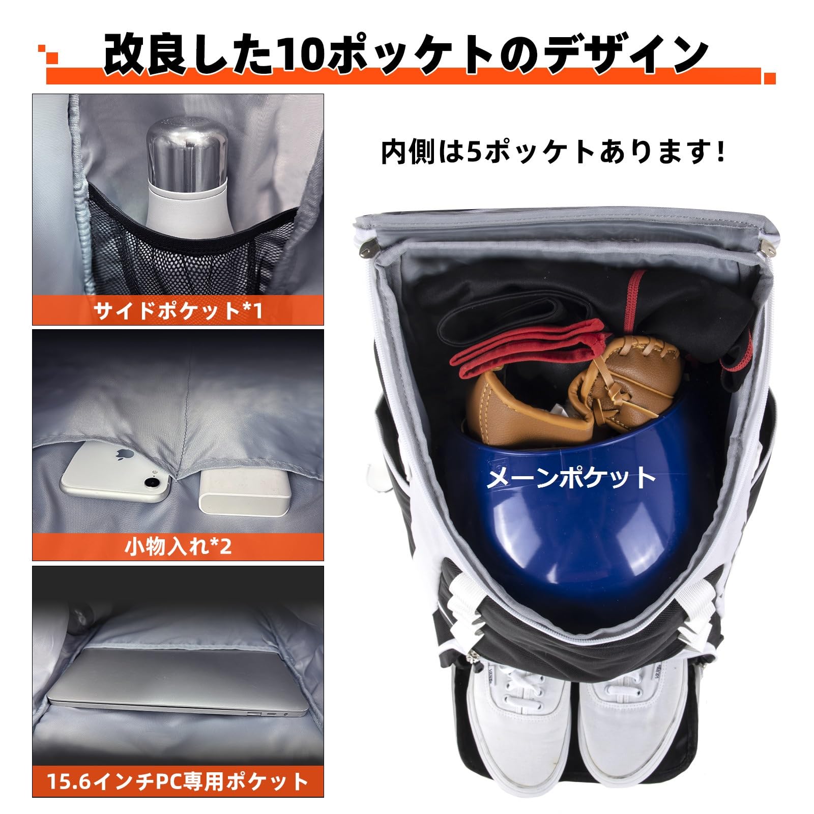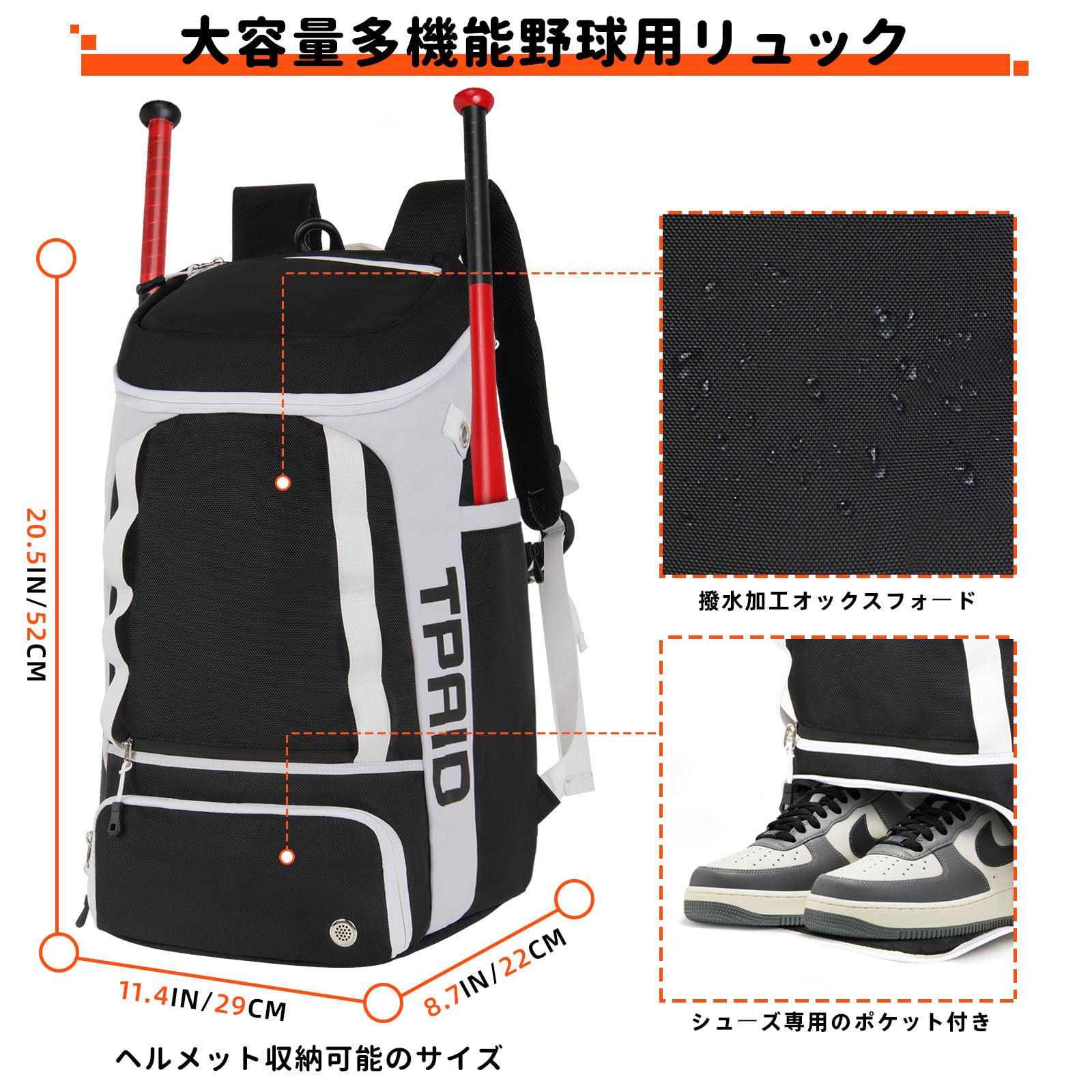 【素材】撥水加工オックスフォード【サイズ】横29cm×縦52cm×幅22cm【重量】1kg【容量】35L【10ポッケト】外側ポケット:トップファスナーポケット*1、シューズ専用コンパートメント*1、隠した格納式ヘルメット収納部*1、サイドポケット*2(バットは2本収納可能)/ 内側ポケット:内部大容量メーンポケット*1、内側サイドポケット*1、小物入れ*2、15.6インチPC専用コンパートメント*1【高品質】野球道具の保管と運搬用のユースベースボールバックパック。野球リュックは頑丈なナイロン素材でできており、野球用品やその他の必需品を摩耗から保護します。高品質の素材と補強されたステッチが耐引裂性と耐久性を提供します。