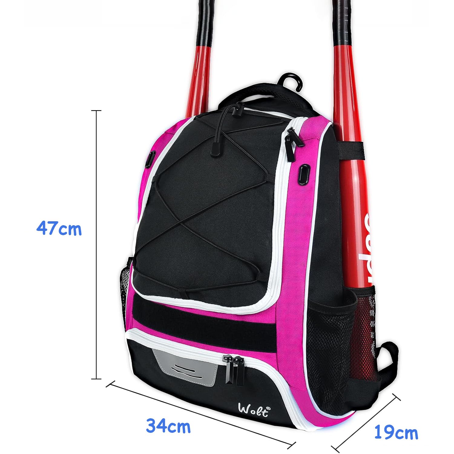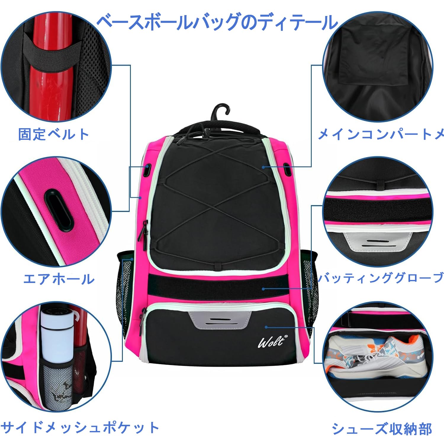 【大容量&多機能野球リュック】ヘルメット、グローブ、タオル、バッティンググローブなどを一括収納可能。靴専用の通気性コンパートメントで汚れた靴を他のアイテムと分離。4つのサイドポケット付きで、2本のバットやウォーターボトルも収納可能