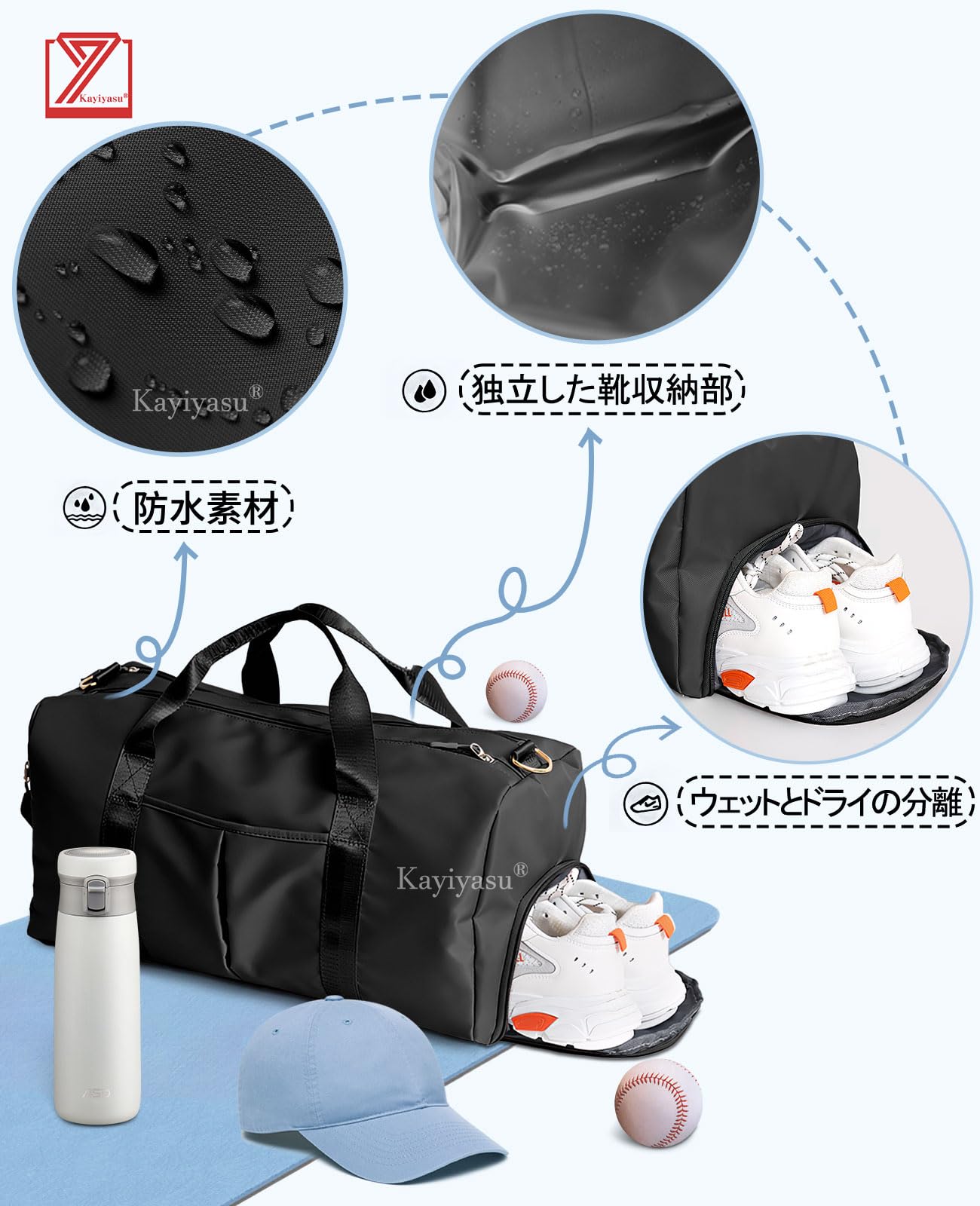 【仕様サイズ】サイズ:49 * 24 * 25CM 重さ:600g 高品質、軽量のオックスフォード布を採用、シワになりにくいです。本体をボストンにすることで荷物量に柔軟に対応した容量30リットル、日帰りに最適な大きさです。メインスペースにラクラクアクセスできる貫通ジッパーで荷物の出し入れも簡単。おりたたみ可で使いわない時はコンパクトに収納がる防水ジムバッグです。