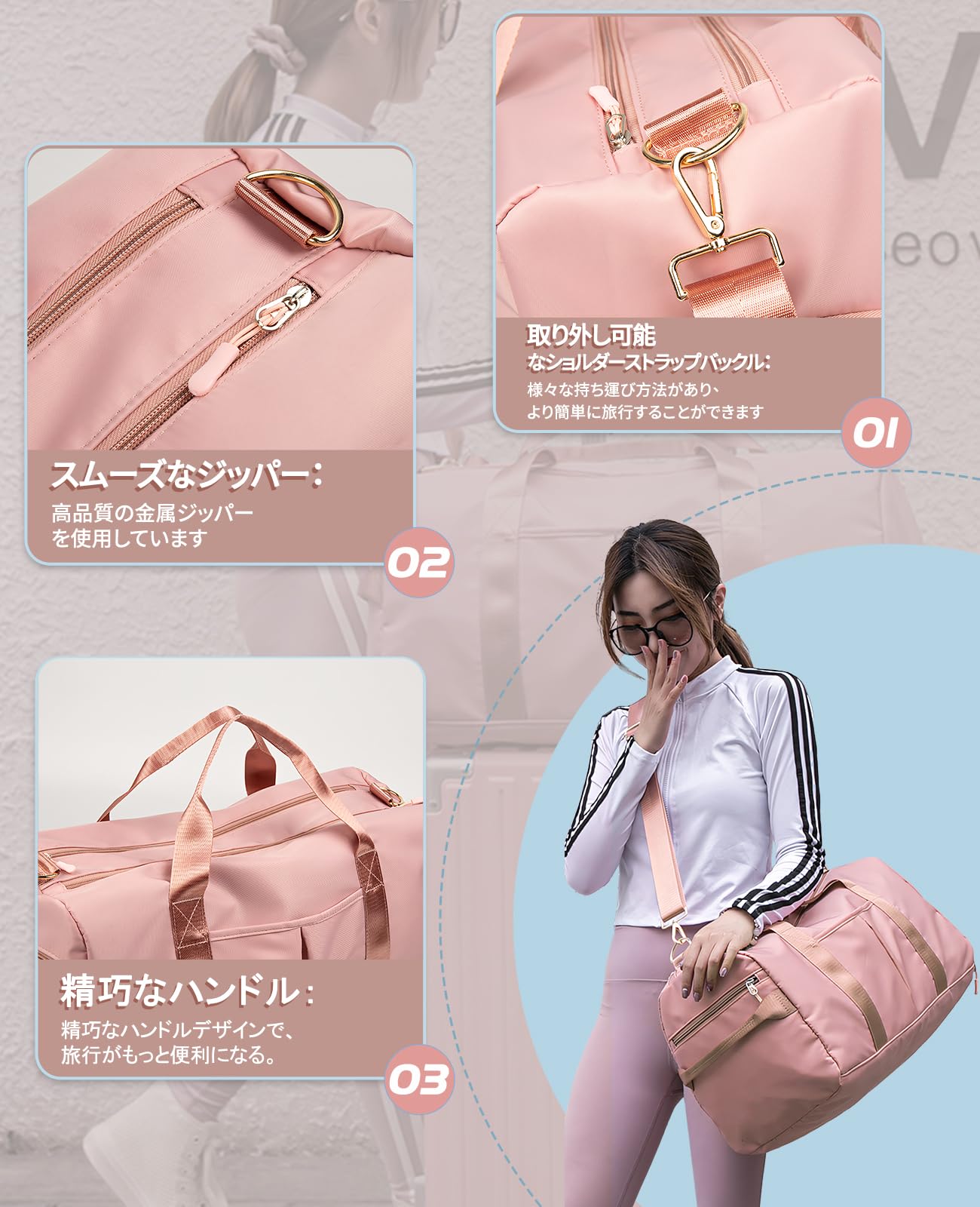 【3way利用可能】乾湿分離ポケット有り:外側3(靴袋、フロントポケット、チャック袋)内側1(防水ポケット) 肩当て付ショルダーベルトが付属しているので、手提げや肩掛け等、ご希望の使用ができます。