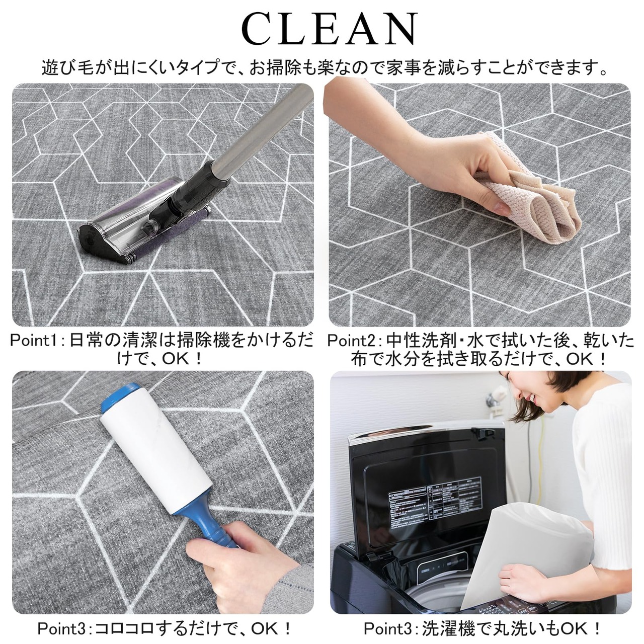 【お手入れ便利】毛足がないので、ゴミが絡みにくく、日常の清潔は粘着クリーナーをコロコロするや掃除機をか けるだけでキレイになります。また、汚れた場合は手洗いや洗濯ネットに入れて洗濯機で洗うことができます(ご 注意:風通しの良いところで陰干しし、アイロン、乾燥機の使用をお避け下さい。)