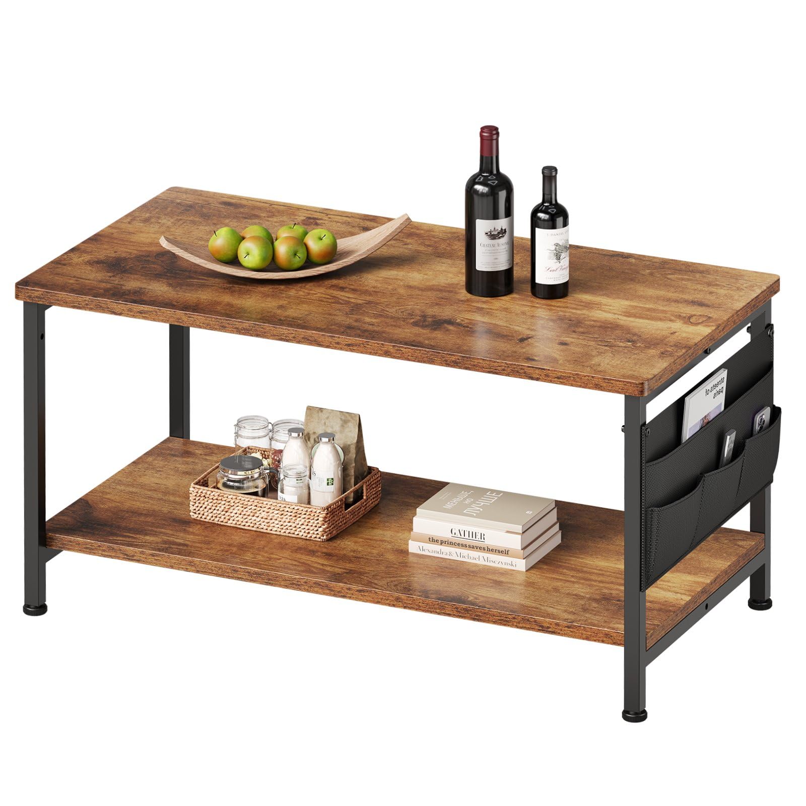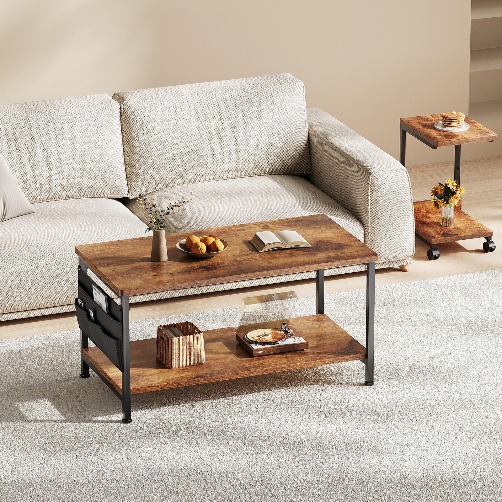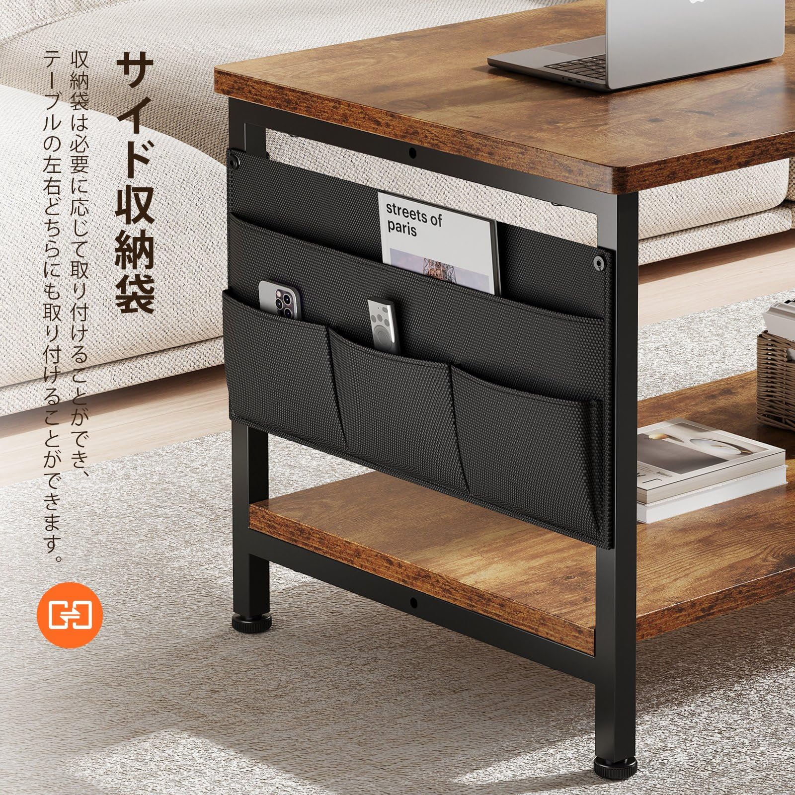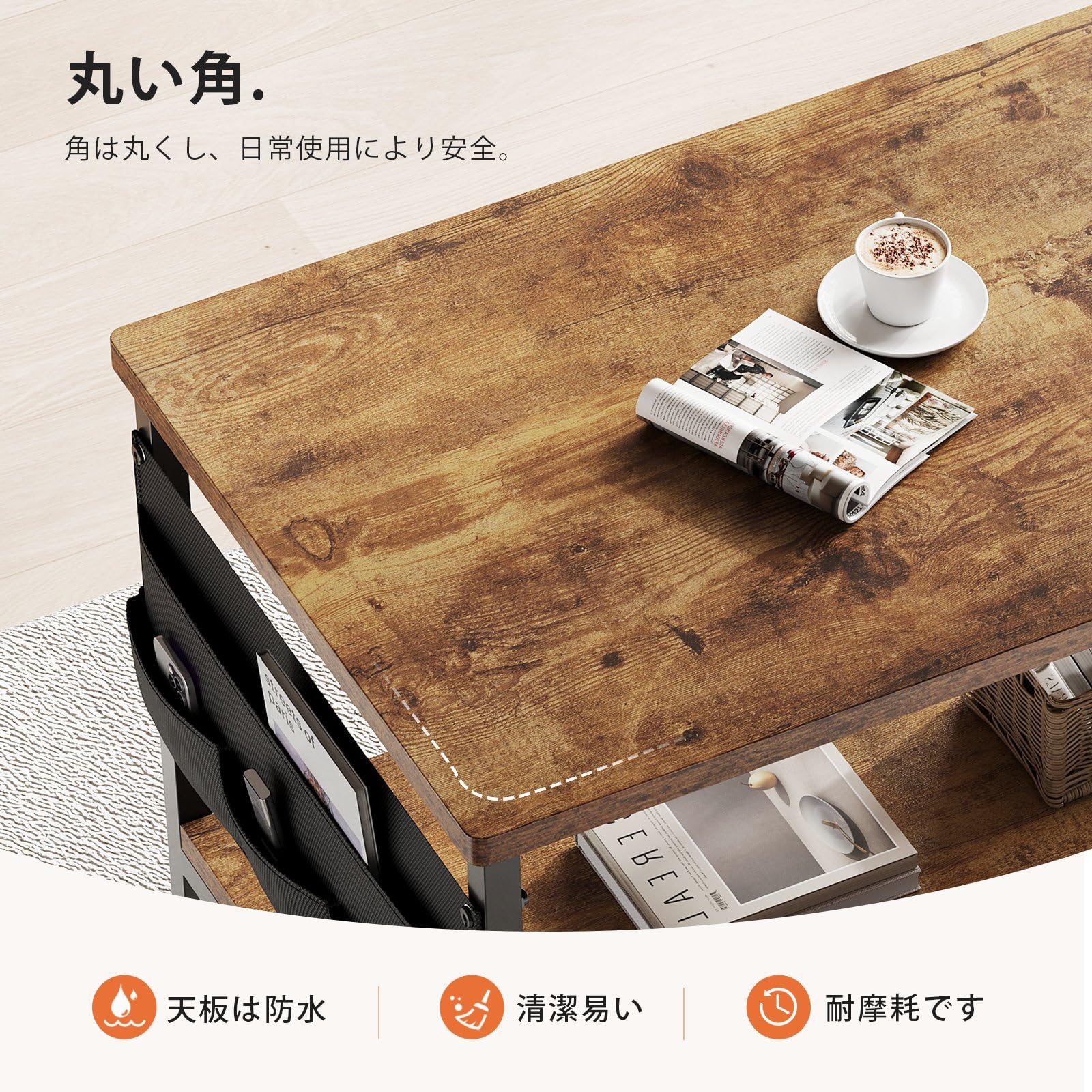 ローテーブル収納付き:サイドには、他のローテーブルにはない布製の収納袋が付いており、リモコンやキーなどの小物類を収納できます。2段の収納スペースは、リビングの必需品を収納するのに十分なスペースを提供します。あなたの応接間をいっそうきれいにすることができます。