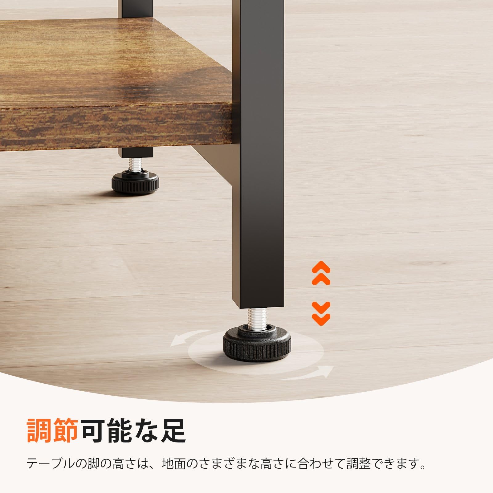 ヒューマンデザイン:ローテーブルの角には衝突を防ぐための円弧デザインが施されています。机の脚に調節する足がついて、各種のでこぼこな地面に適応すると同時に地面を傷つけることを防止します。