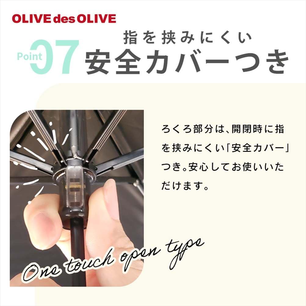 傘を開く部分は安全カバーがついており、指を挟みにくい仕様になっています。また、手元は抗菌加工を施した手元を使用しています。