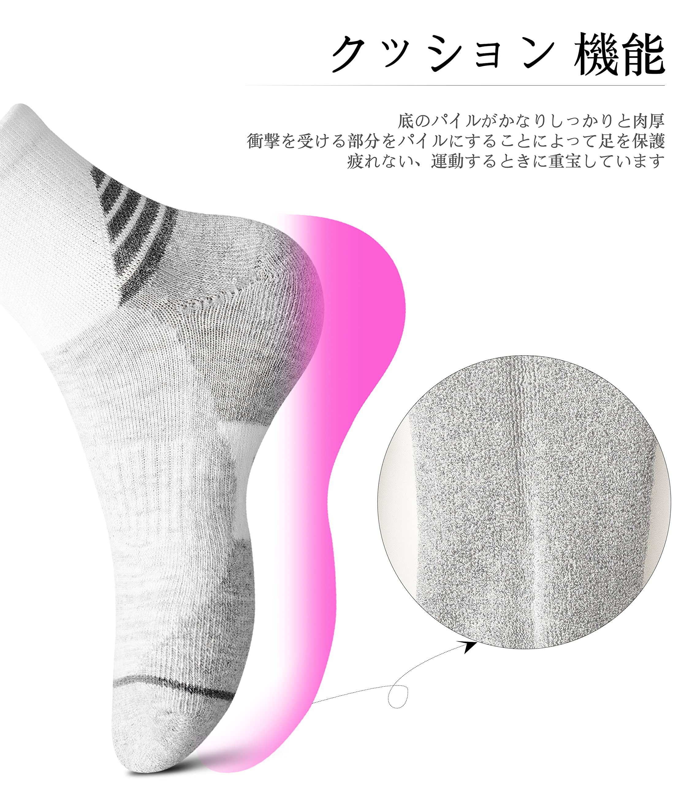 クッション 機能: 底のパイルがかなりしっかりと肉厚、衝撃を受ける部分をパイルにすることによって足を保護、疲れない、運動するときに重宝しています、長い距離を走っても問題なく使えてます。クッションも有り履き心地良いです。つま先部もやや厚めになっていて耐久性も良さそうです、丈夫で長持ち