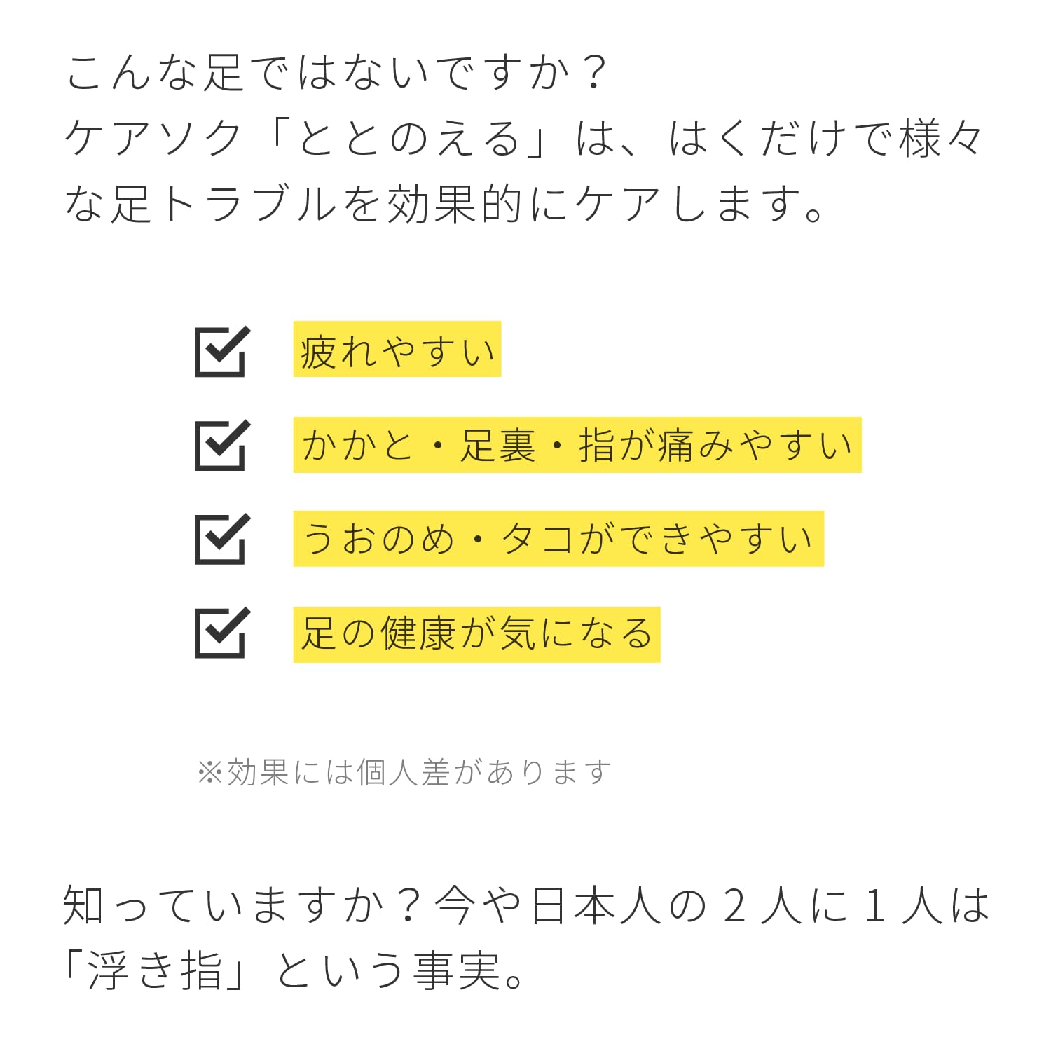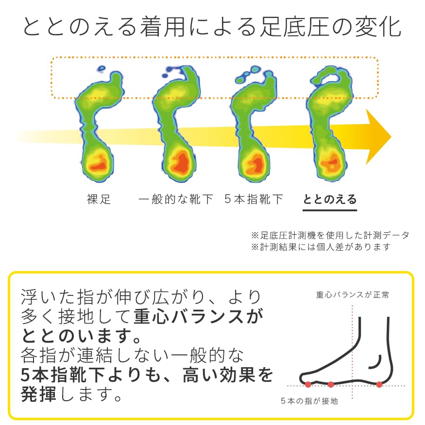 【医師がすすめる サポート靴下】足元から健康を考えるあなたへ。一般的な5本指靴下よりも重心バランスが整い、足裏全体で地面をとらえることができるため健康につながる歩行が可能になります。効果的なデータと科学根拠に基づき、様々な足のお悩みにお使いいただけます。