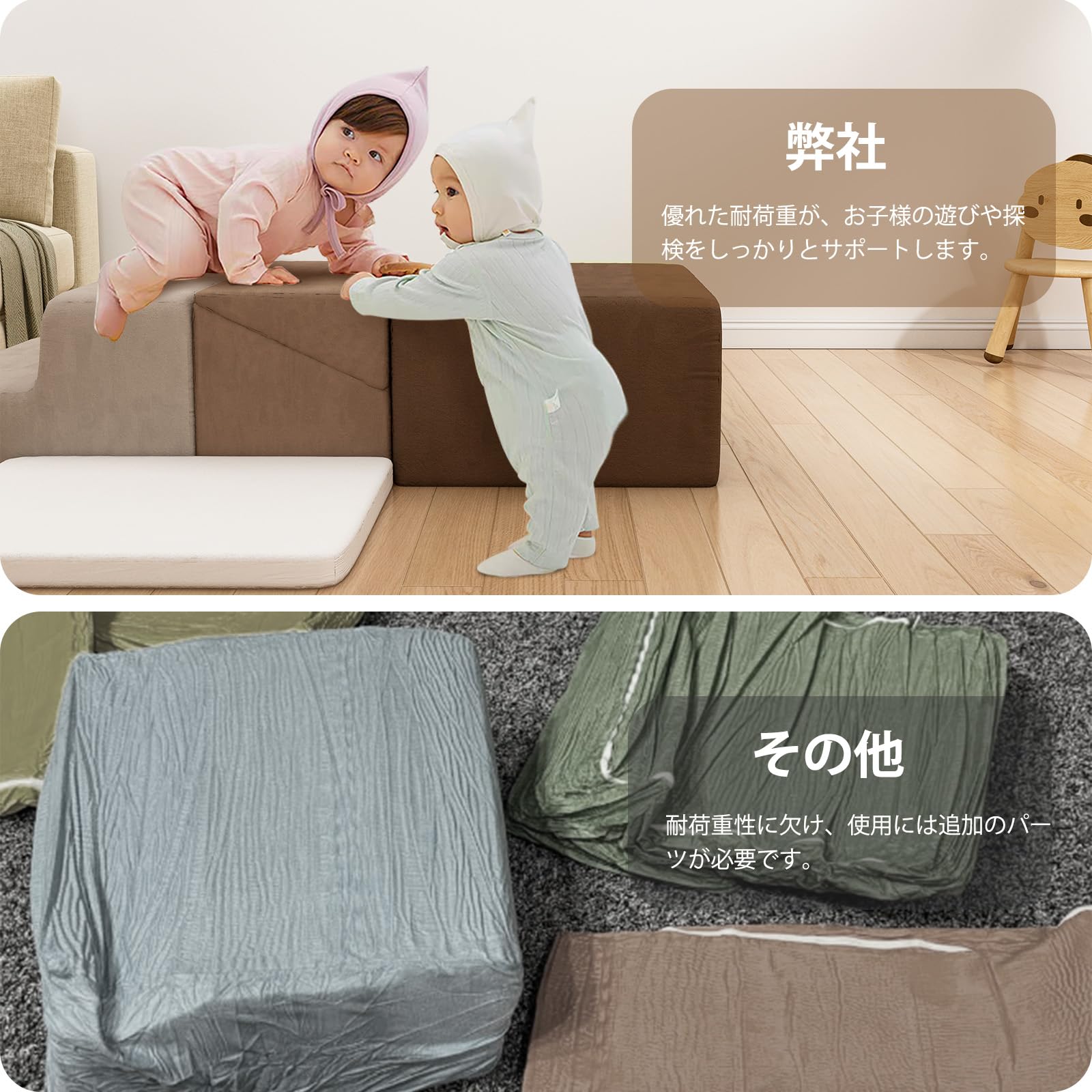 【自由に組み合わせ可能】このセットには6つのフォームクライミングブロックが含まれており、自由に組み合わせて登ったり、這ったり、滑ったり、積み上げたりといった多様な活動を楽しむことができます。子どもたちの運動能力や身体の協調性、創造的な遊びを育むのに役立ち、室内玩具としての大きな魅力となっています。