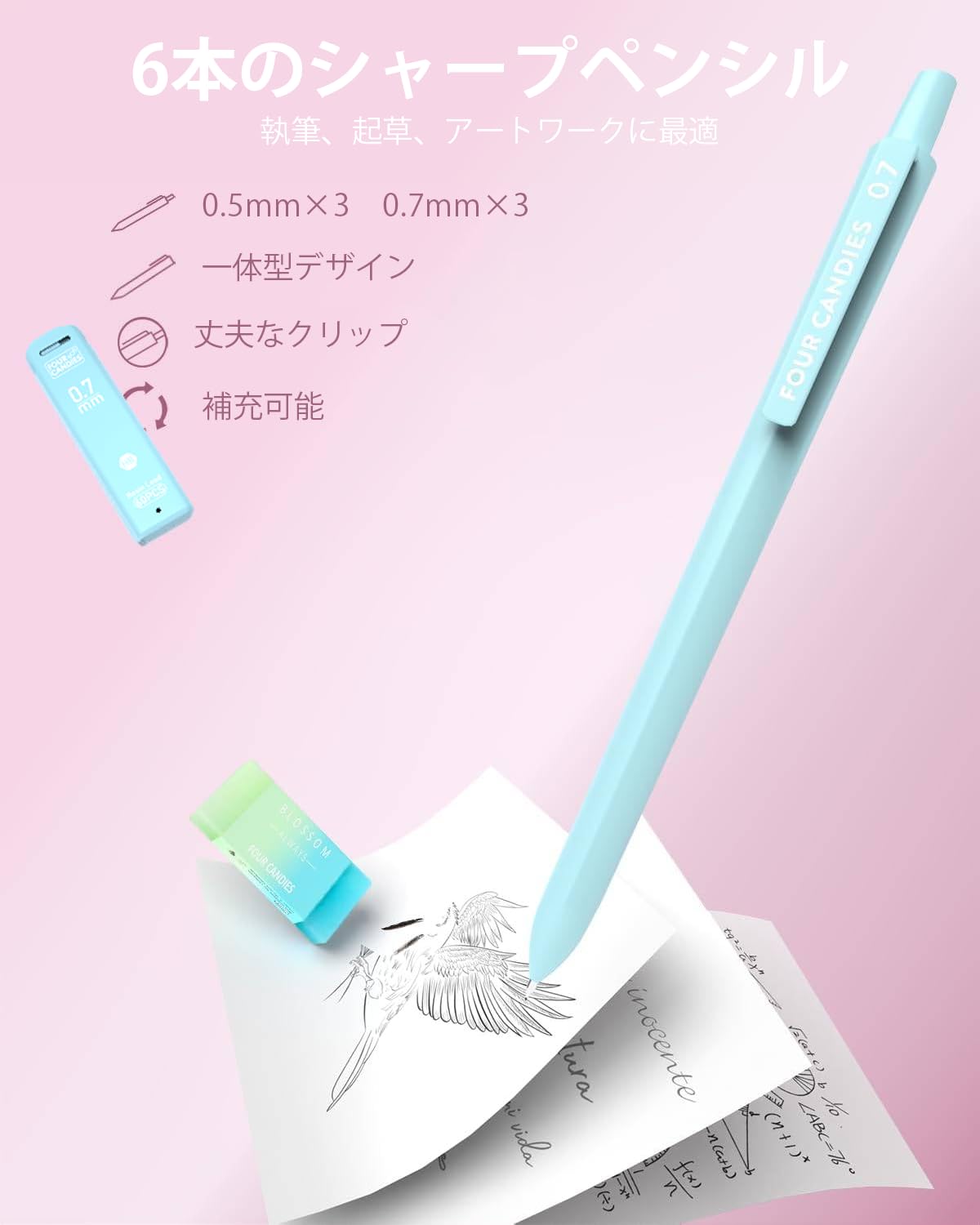 アーティスト用シャープペンシル6本セット: 0.5mm芯3本、0.7mm芯3本、#2芯リフィル6本、ゼリー消しゴム3個、キャップ消しゴムリフィル9個。人間工学に基づいた三角形のグリップが快適な持ち心地を生み、快適な書き心地と描き心地をお約束します。注:このセットは3歳以上のお子様に適しています。