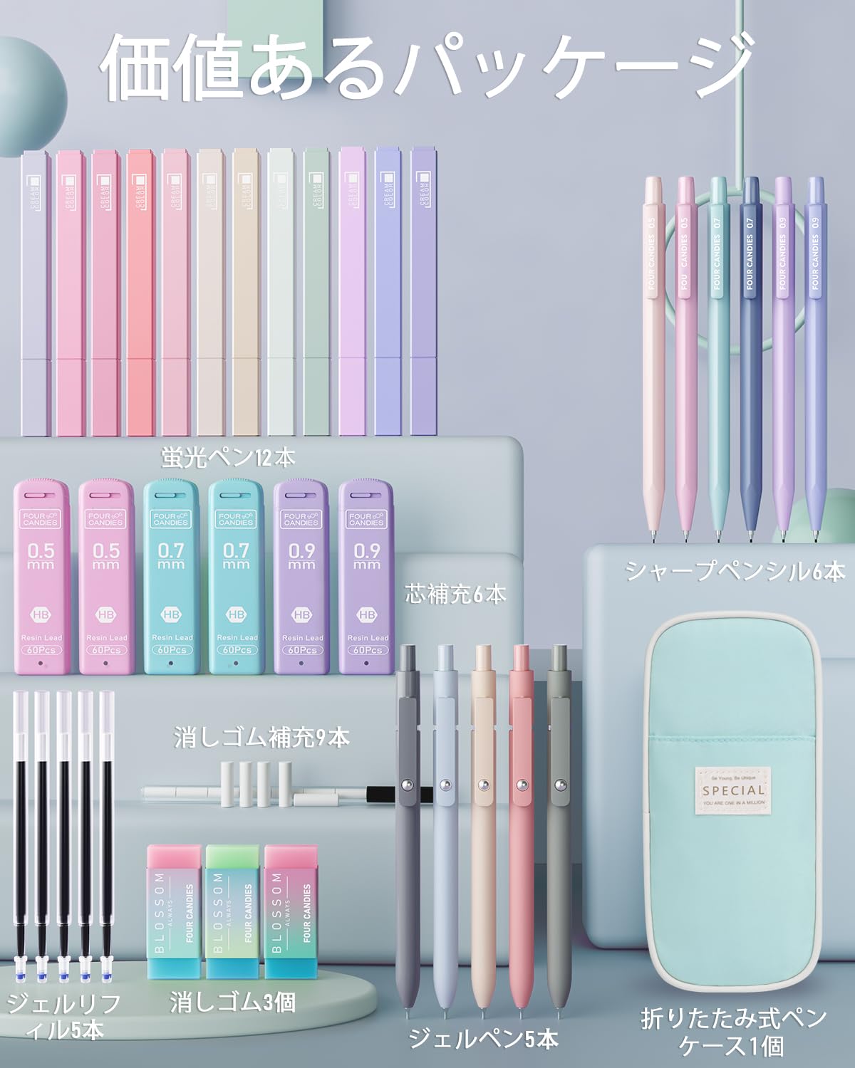【在庫処分】Four Candies 文房具セット 筆箱 蛍光ペン ボールペン 0.5 & 0.7&0.9mmシャープペンシルセット 学用品 学生 文具 入学準備 誕生日 入学祝い プレゼント 女の子 男の子 人気 おしゃれ かわいい ブルー | GIGATERA