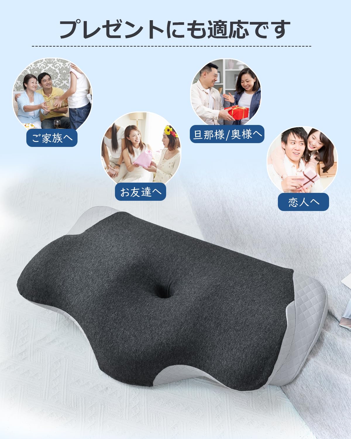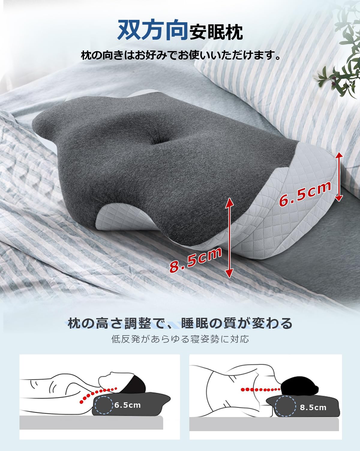 【良い睡眠体験を実現する高さ調節可能】枕は体型に合わせて使えるように設計されています。低めの側が6.5cm、高めの側が8.5cmの2段階高さ調節が可能です。高めの枕が好みの方にも、低めの枕が好みの方にもご利用いただけます。耳と後頭部の凹型中空設計と両側の曲線でデザインされたこの枕は、首の自然な湾曲と背骨の自然な位置をサポートし、頭、首、肩をしっかりと優しくサポートします。※サイズ表記は実寸のため、多少の誤差が生じる場合がでさいます。予めご了承ください。