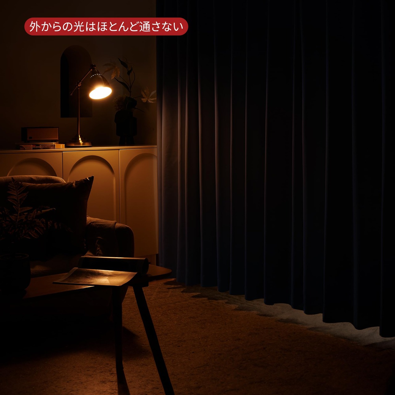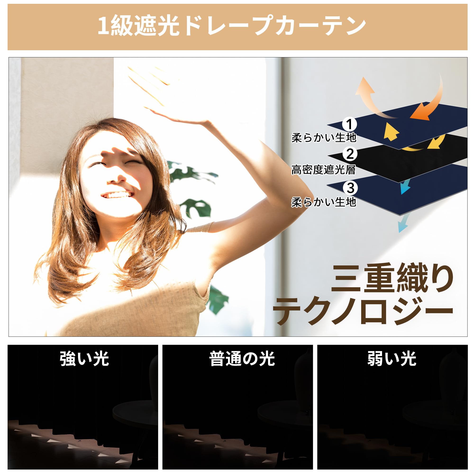 【遮光性能と等級】厚手ポリエステル生地で光をほぼ完全に遮り、深色カーテンは1級遮光(遮光率99.99%・日本JSL認証取得)で昼間の強い日差しや夜間の視線を効果的に防ぎ、安心してお休みいただけます。