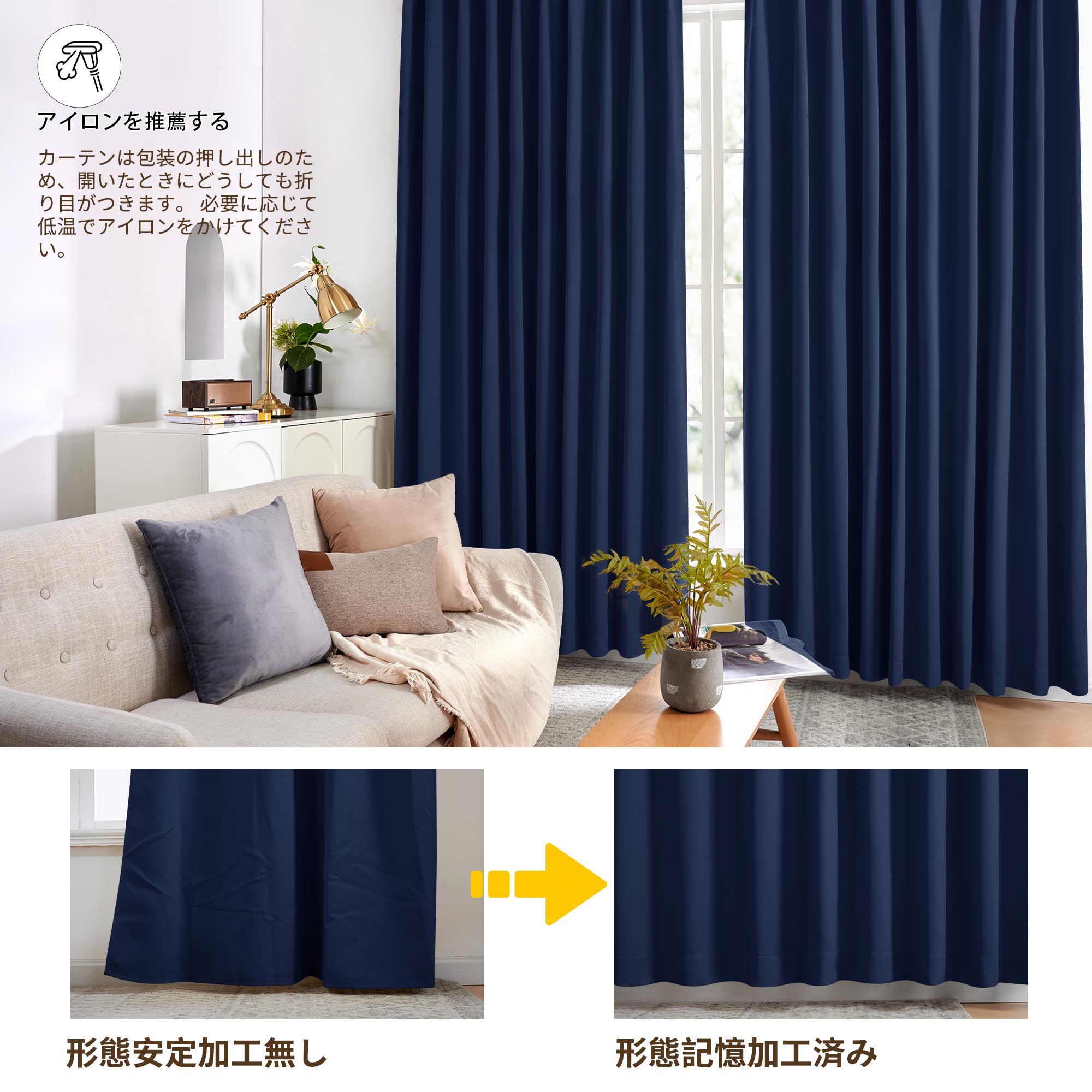 【形態記憶と美しいライン】形態記憶加工により吊るした瞬間から美しいドレープが整い、お部屋をすっきり演出します。窓幅に対して1.5倍程度のカーテン幅で吊るすとより高級感のある見た目になります。