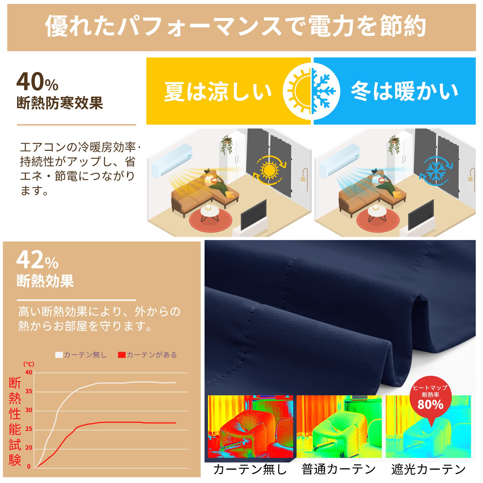 【季節を通して快適】厚手生地が夏の熱気や冬の冷気をやわらげ、冷暖房効率アップをサポートします。省エネ効果を意識しながら、春夏秋冬いつでも快適な空間を作ります。※効果は設置環境により異なります。