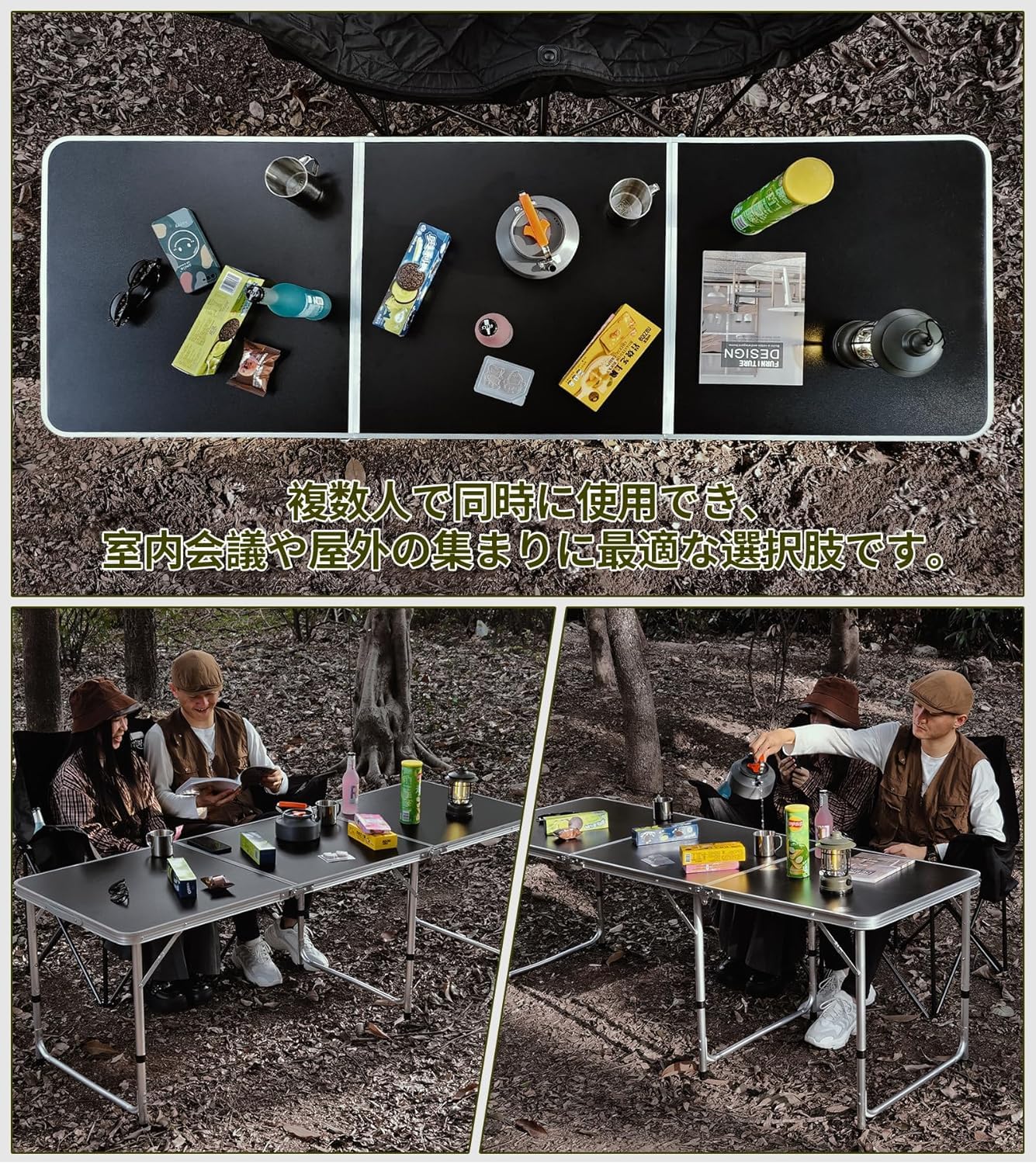 ?【3WAYテーブル】◆アウトドアキャンプテーブルとして、複数の友人や家族の集まりに対応でき、軽量で持ち運びが簡単、片手で持ち上げることができるため、花見や海辺、バーベキューなどのアウトドア活動にも適しています。◆会議テーブルとして、複数人で使用でき、展開と収納は数秒で行え、収納スペースは約10cmの隙間だけで済みます。◆さらに、ダイニングテーブルや作業台、子供の工作テーブルとしても使用できます。部屋全体のスタイルとランクを向上させます。?2つ以上の購入が可能で、さまざまな配置方法に対応しています。並べたり、L字型にしたり、直線的に配置することができ、異なる使用シーンに対応します。