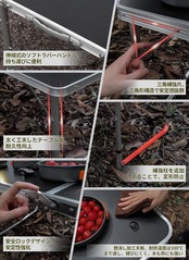 ?【素材】材質:フレーム/アルミニウム、他、天板/メラミン加工合板(抗菌加工) 。天板の耐熱温度は100℃まで達し、錆びにくく、水と熱にも強いので、鍋やフライパンなどの熱い物を置いたりご使用頂けます。おしゃれな見た目でお手入れも簡単、水や汚れもすぐ落ち、実用性と耐久性を両立しています。手触りがよく、滑り止めだけでなく美しい。人気の木目調素材を採用し、ナチュラルスタイルでよく馴染みます。お部屋でもキャンプでもこれひとつでばっちり。