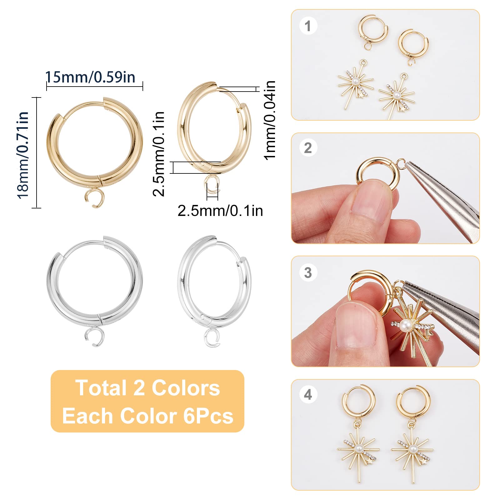 【12個2色イヤリングフック】:フープピアスパーツは銀色と金色があり、毎色フープピアスパーツは6つで、合計6対イヤリングを作ることができ、サイズに異なるフープピアスパーツ必要とするお客様に最適です。