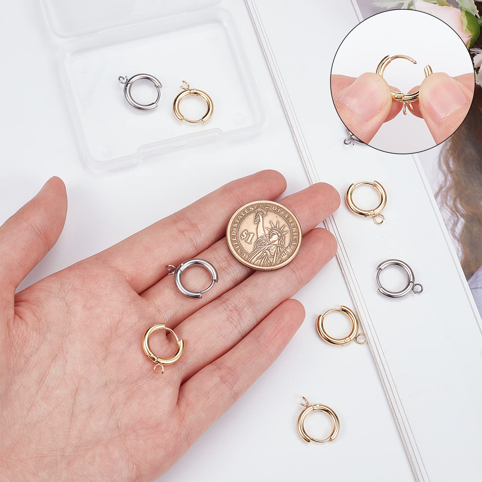フープピアスパーツのサイズは同じ:長さ:14.5~15mm、幅(ジャンプリングを含む全長):17~17.5mmで、穴:2.5mmです。収納ケース*1つです。