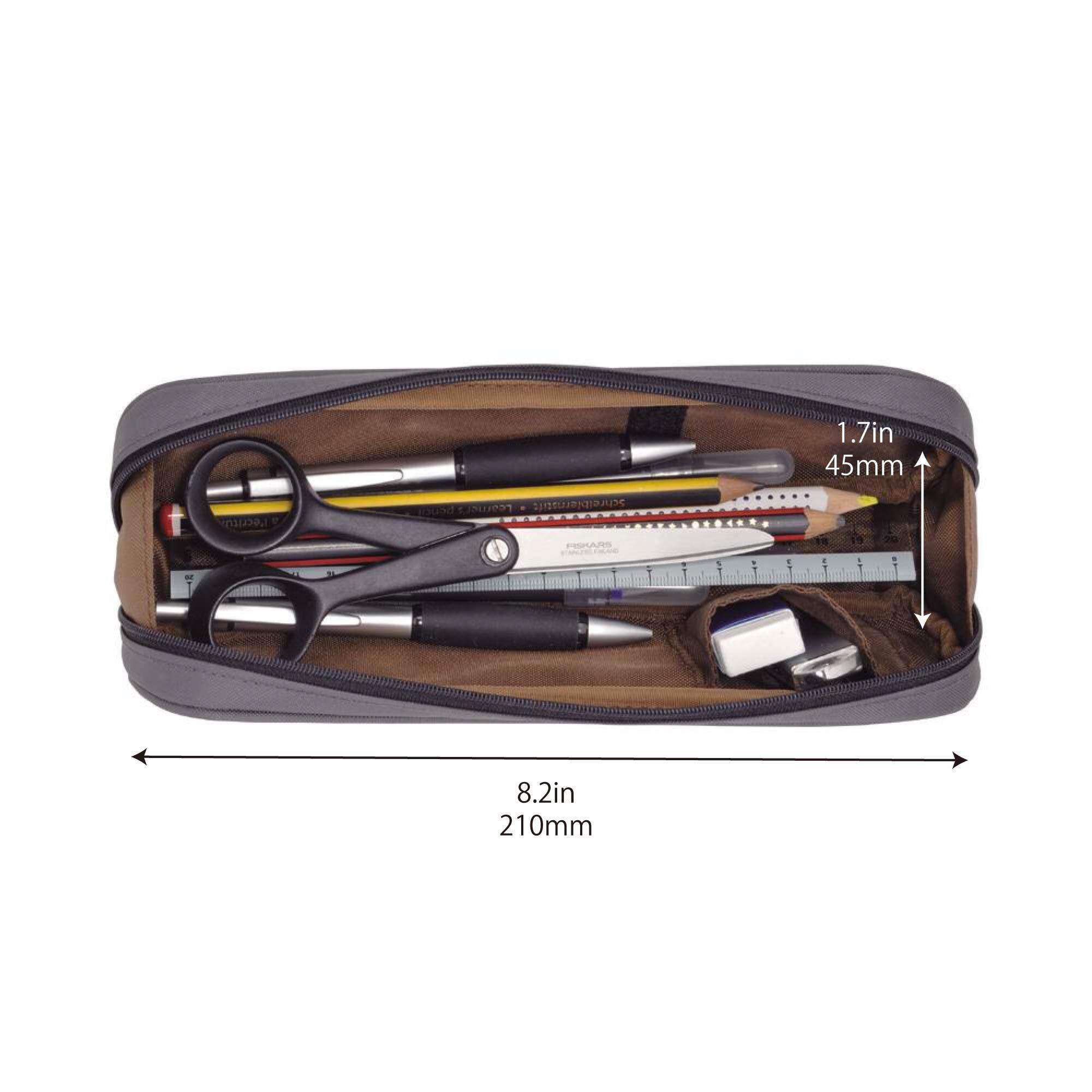 ●仕切りが動くから使い方2ウェイ!●面ファスナーで留められた仕切りを動かすことで内部の仕切り方を2ウェイに。●小物スペースを大きくとれ、ペンと分けて収納できます。●仕切りを外せばスペースが広がり、横面に移動した仕切りに消しゴムなどが入ります。●20cm定規や鉛筆が入るファスナー付ポケット。