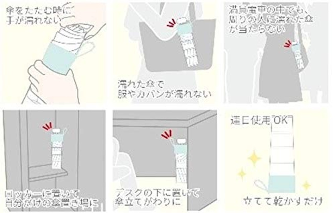 濡れた傘の雫を周りにまき散らさないように竹の子状のケースに入れて持ち運びは如何でしょうか?