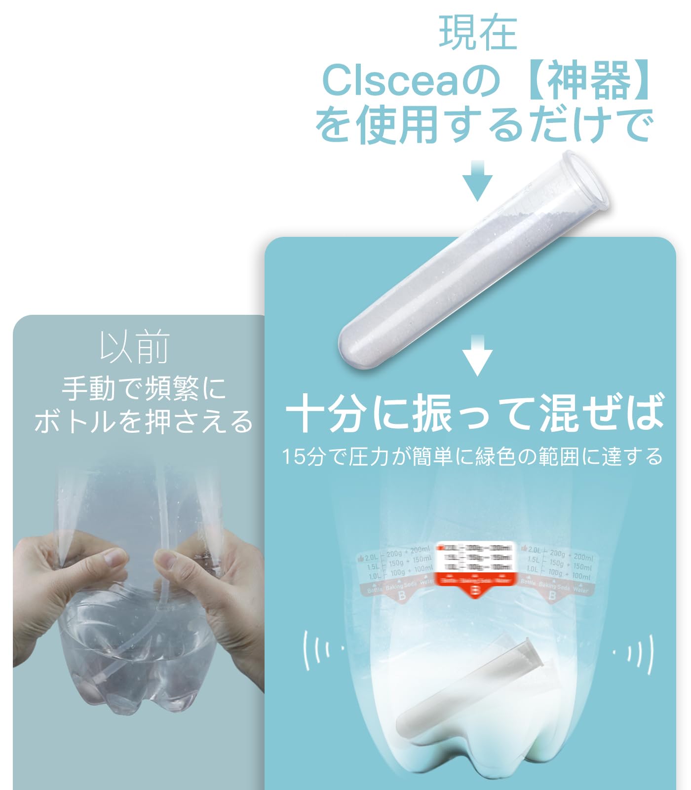 【Clscea圧力アップグッズ】:頻繁にボトルを揉む作業必要はありません。「グッズ」中にクエン酸を投入し、振って溶解すると、わずか 15 分で緑色の圧力範囲に達します。