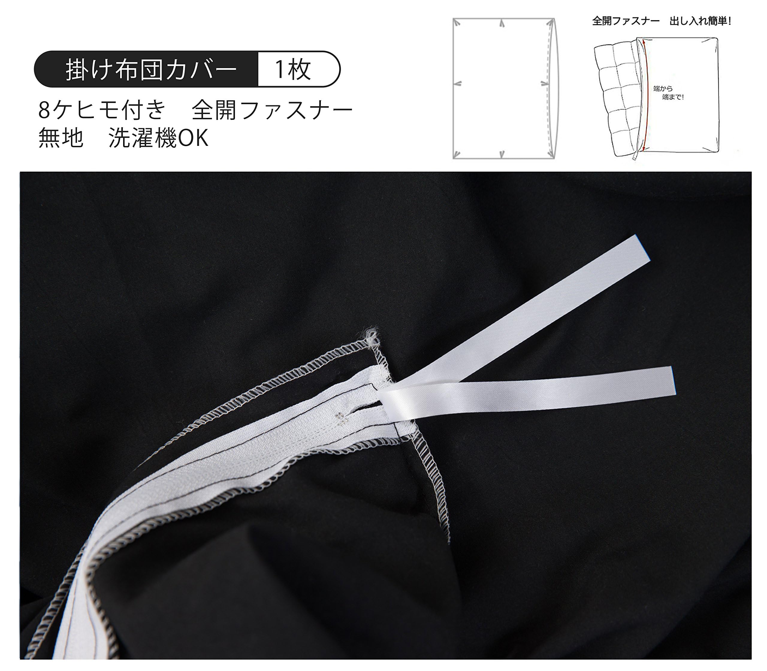 【和式用仕様】掛布団カバー:片側全開ファスナー使用,布団留めひも8ヶ所 / 敷布団カバー:全開ファスナー使用、敷布団全体をすっぽり包むタイプです。/ ピロケース:中かぶせ式、ファスナーなどの金属バーツがないので、就寝時にじゃまになりません。