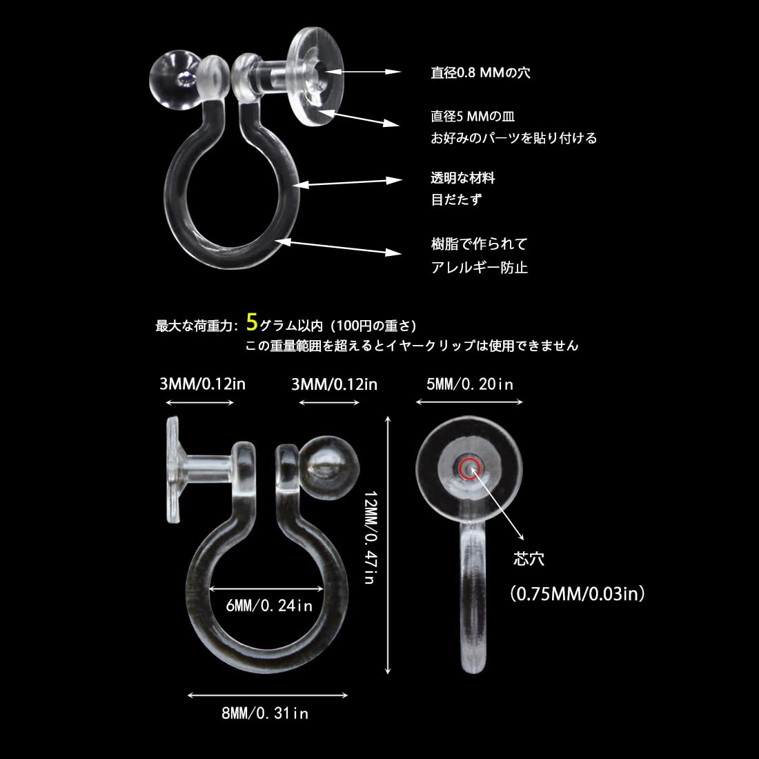 ※素材は樹脂で、金属アレルギーの方にオススメです。ピアスの穴を開けていない方、通常のイヤリングが苦手な方、お子様にもオススメです。
