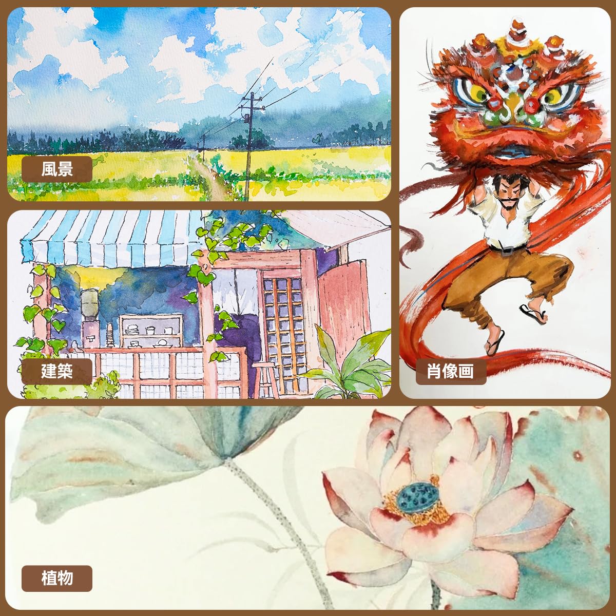 【高品質顔料】水彩絵の具は流動性と拡散性に優れているため、にじみ、ぼかし、重ね塗りなどの他の技法でも簡単にさまざまな水彩画の技法を実現でき、美しい色を維持して表現できます。風景や水墨画に最適です。