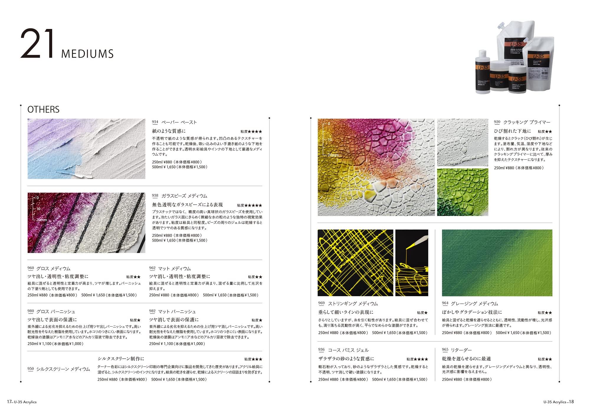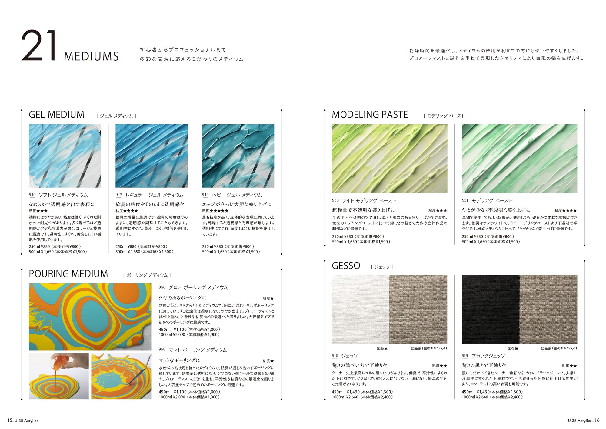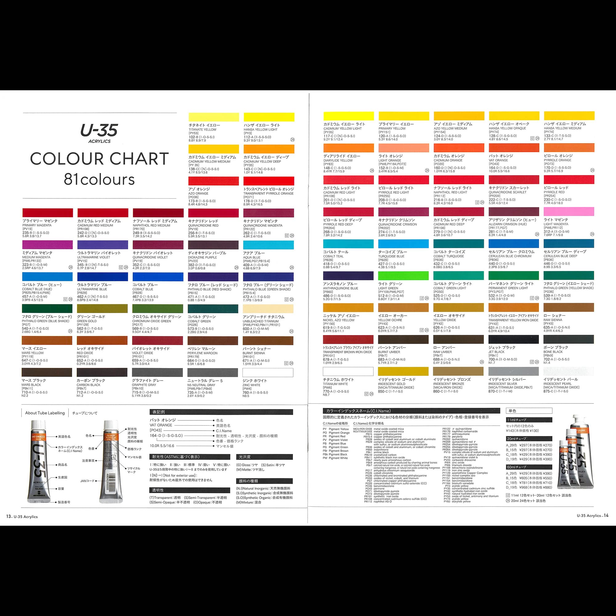 「U-35」は発色の精度にこだわり、全81色のうち66色が単一顔料。極めて濁りの少ない混色を実現します。同時に作品を長期間保存するための耐光性を追求。こだわりの発色と耐光性を両立する顔料を選び抜いた後、さらに発色をよくする色出しは職人の技で綿密に行います。また余計な原材料を徹底して省き、顔料を主役に設計した顔料濃度の高さも特長。高濃度のリスクである乾燥後のトラブルや定着力の問題を解決しつつ、顔料と樹脂のバランスを精査しました。「U-35」は次世代アーティストはもちろん、プロアーティストの要望にもしっかりと応えることのできるピュアな発色と高レベルの耐光性をそなえています。