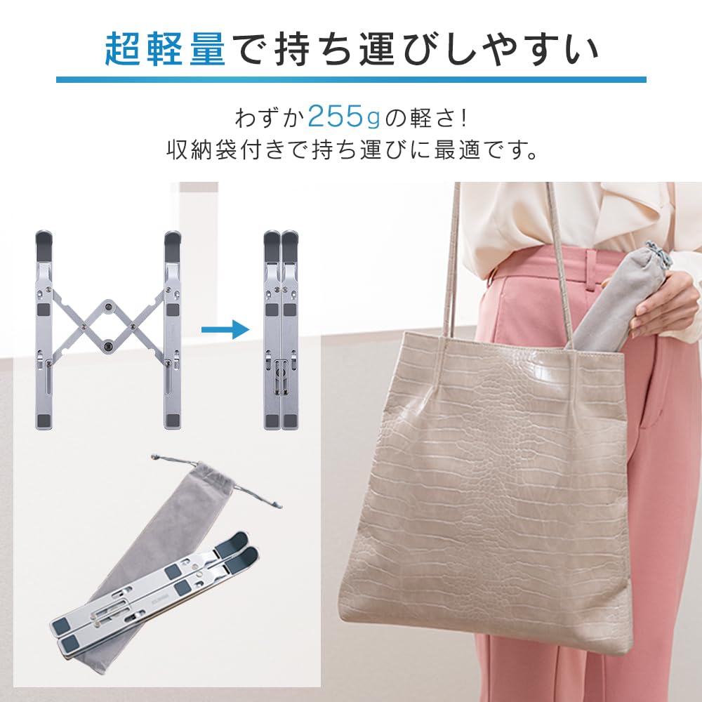 超軽量で持ち運びに最適、角度が7段階に調節可能なPCスタンドです。