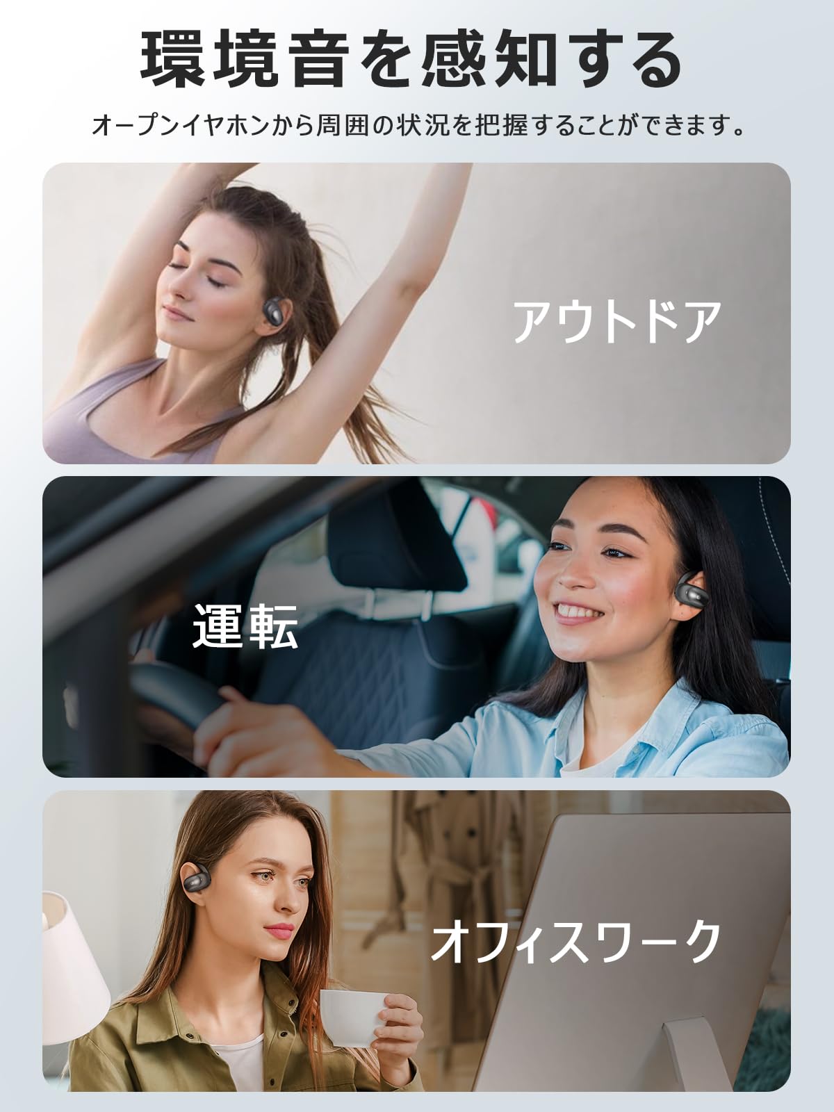 【イヤホン9g・フリー感】超軽量で、もはや体の一部、極上のフィット感は付けていることを忘れるほど。クリアで軽くて聴き疲れしにくいイヤホンです。通話/音楽を聞きながらでも、環境音(車や信号の音など)をしっかり聞き取る事ができ、デスクワークをしながらお気に入りの音楽を聴いても問題ありません。
