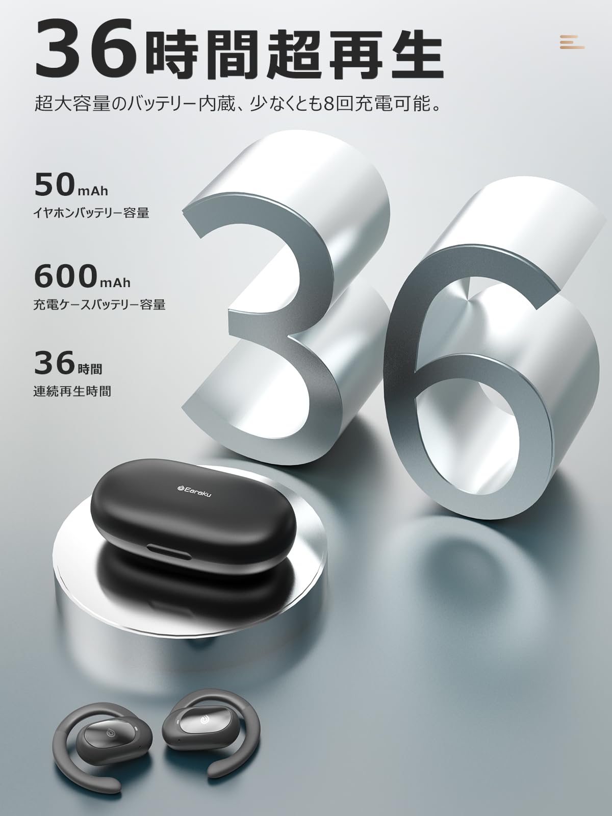 【パーソナライズ・角度調整可能】ご自身の耳に合う角度にパーソナライズできるため、快通な着け心地を実現すると同時に低音から高音域までパワフルなサウンドを届けることを可能にします。骨伝導ではなく、音を空気振動として鼓膜経由で聴覚に伝える、「周りの音が自然!ながら聴きに最適!」が伝えるEaraku「2024新感覚」オープンイヤーです。