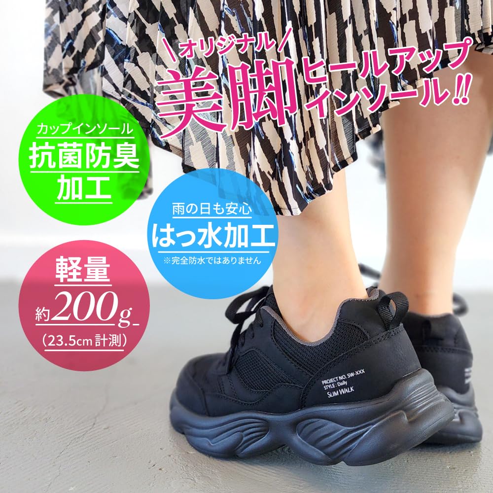 【新着】[スリムウォーク] スニーカー レディース 厚底5.5cm ウォーキング ランニング ダッドスニーカー 抗菌 防臭 美脚インソール 通気性 黒 グレー ベージュ 22.5 23.0 23.5 24.0 24.5