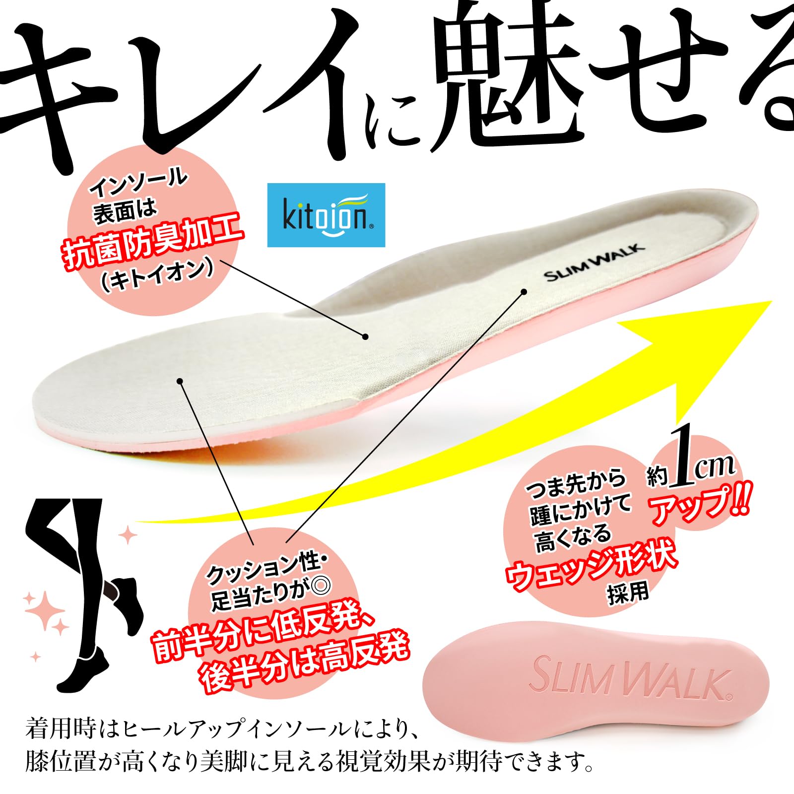 【オリジナル美脚インソール搭載】 ヒールアップインソールによりスッキリ見え、着用時に膝位置が高くなり美脚に見える視覚効果が期待できます つま先からかかとにかけて高くなるウェッジ形状です