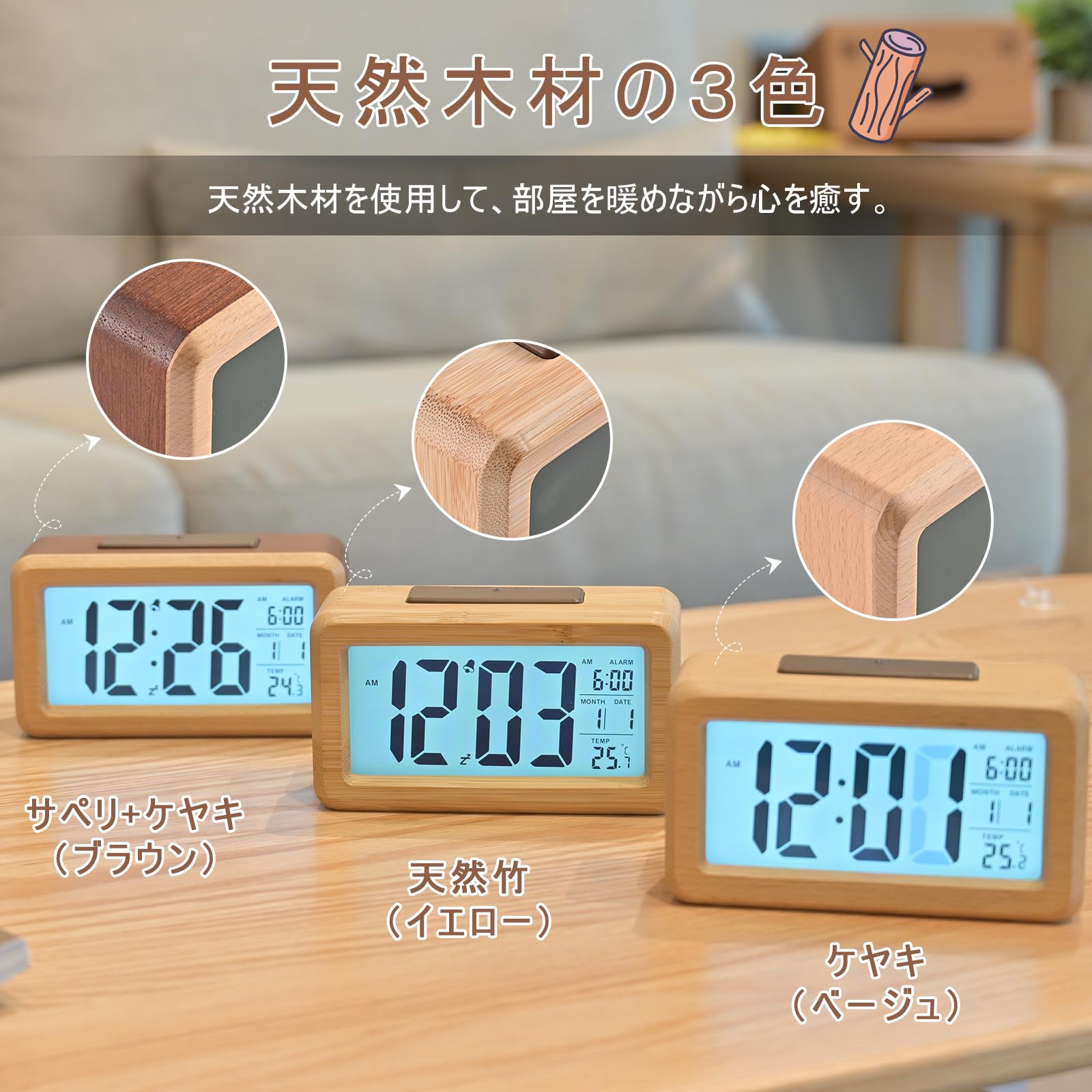 デジタル目覚まし時計 電池式 木製置き時計 温度検出電子時計 持ち運びが容易、寝室、ベッドサイドテーブル、机、オフィス、子供、家族に適しています (ブラウン)