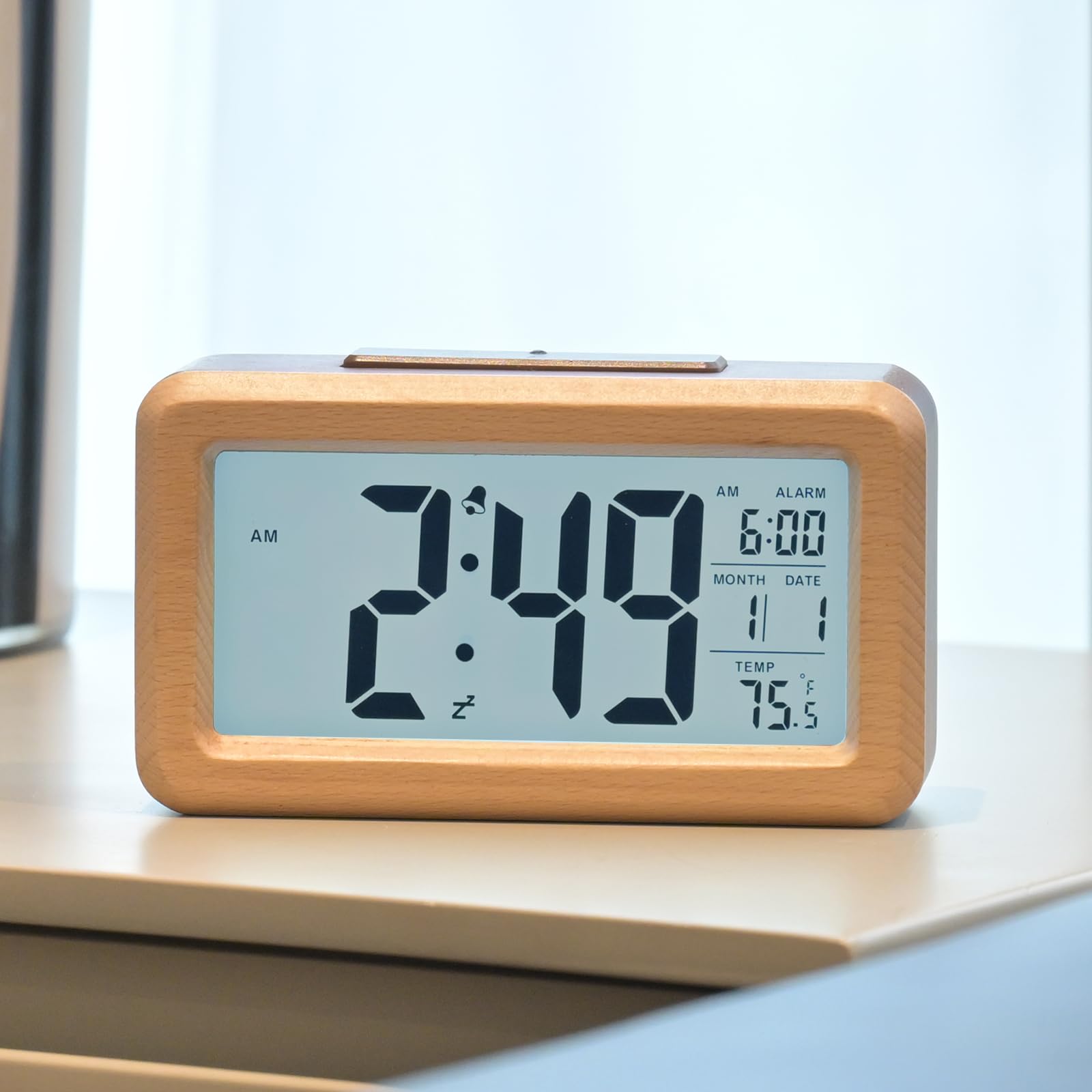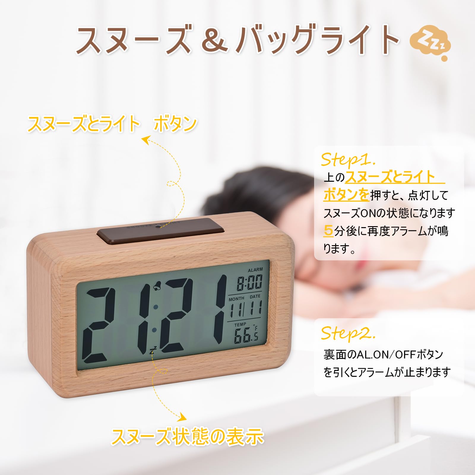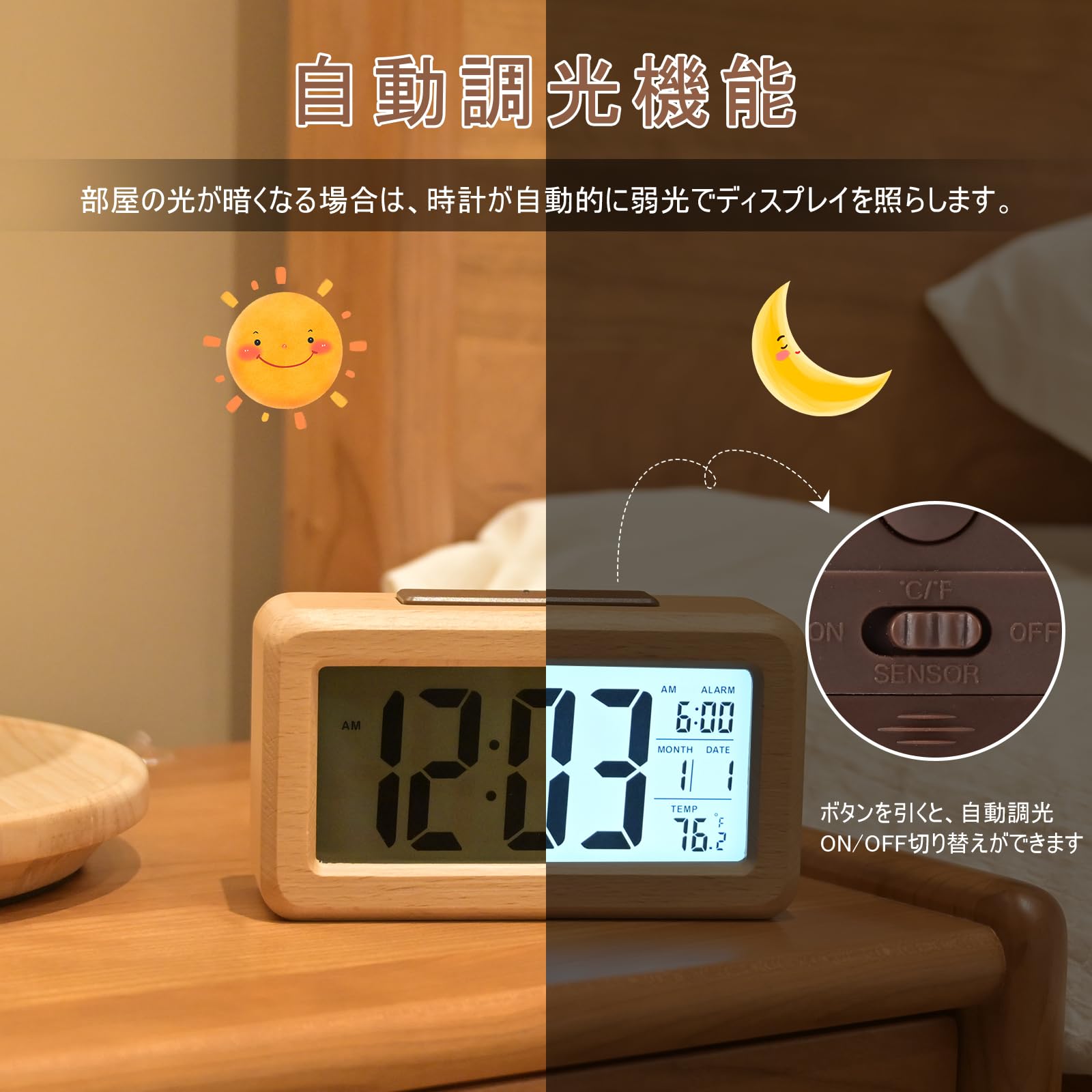 スマートライトセンサー-時計の裏側にボタンがあり、オンとオフを切り替えることができます。 オンにすると、時計は夜に自動的に柔らかな白色光を発します。 オフの場合、LIGHTボタンを押すと時計は5秒間だけ点灯します。 省エネで夜の観察に便利で、快適で静かな睡眠環境を提供します。注:アラームクロックの上部にあるボタンを押すときは、画面の横から少し押す必要があります。そうしないと、ボタンが無効になります。。