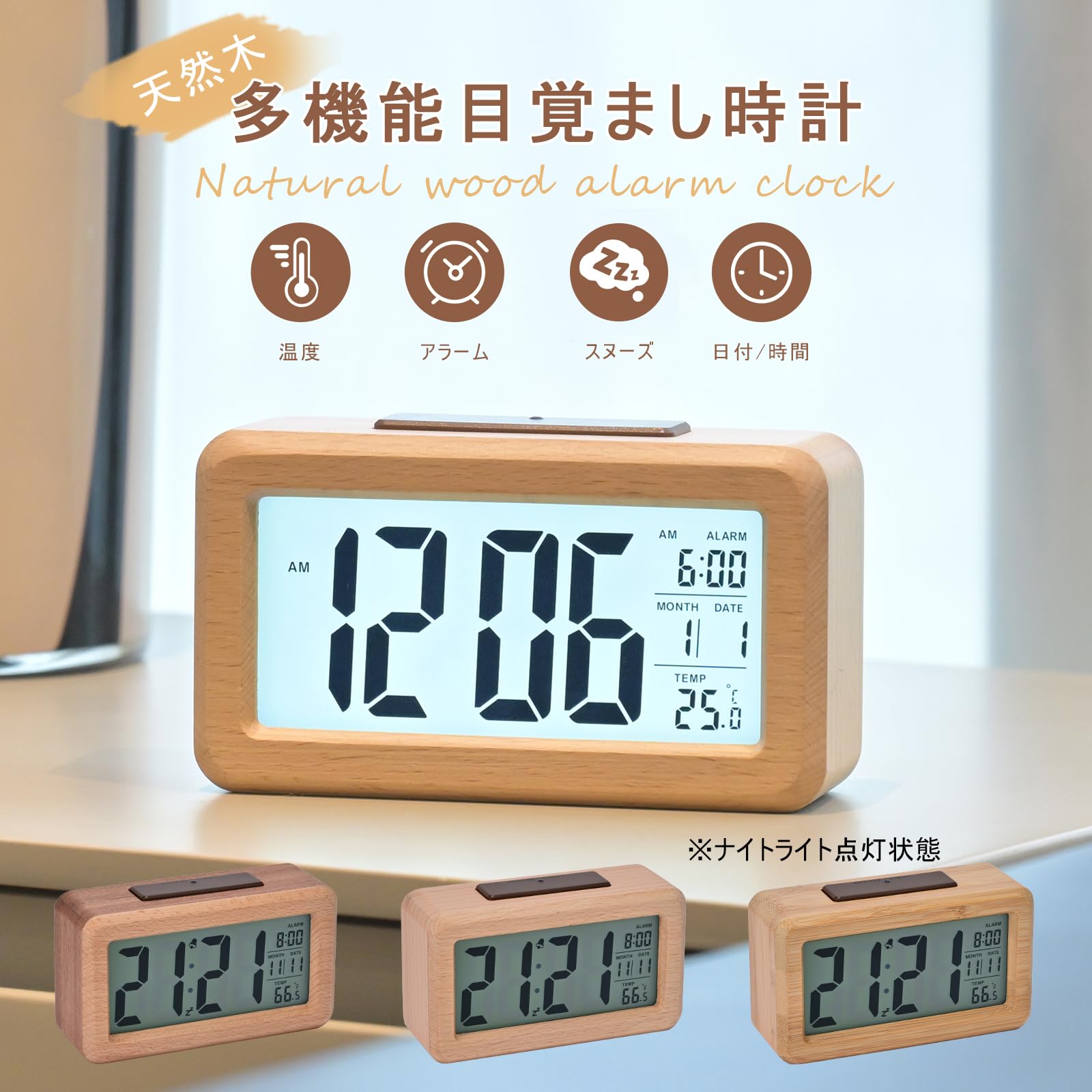 特徴 カレンダー表示, 大音量アラーム, 温度表示, 目覚まし時計, 自動調光可能