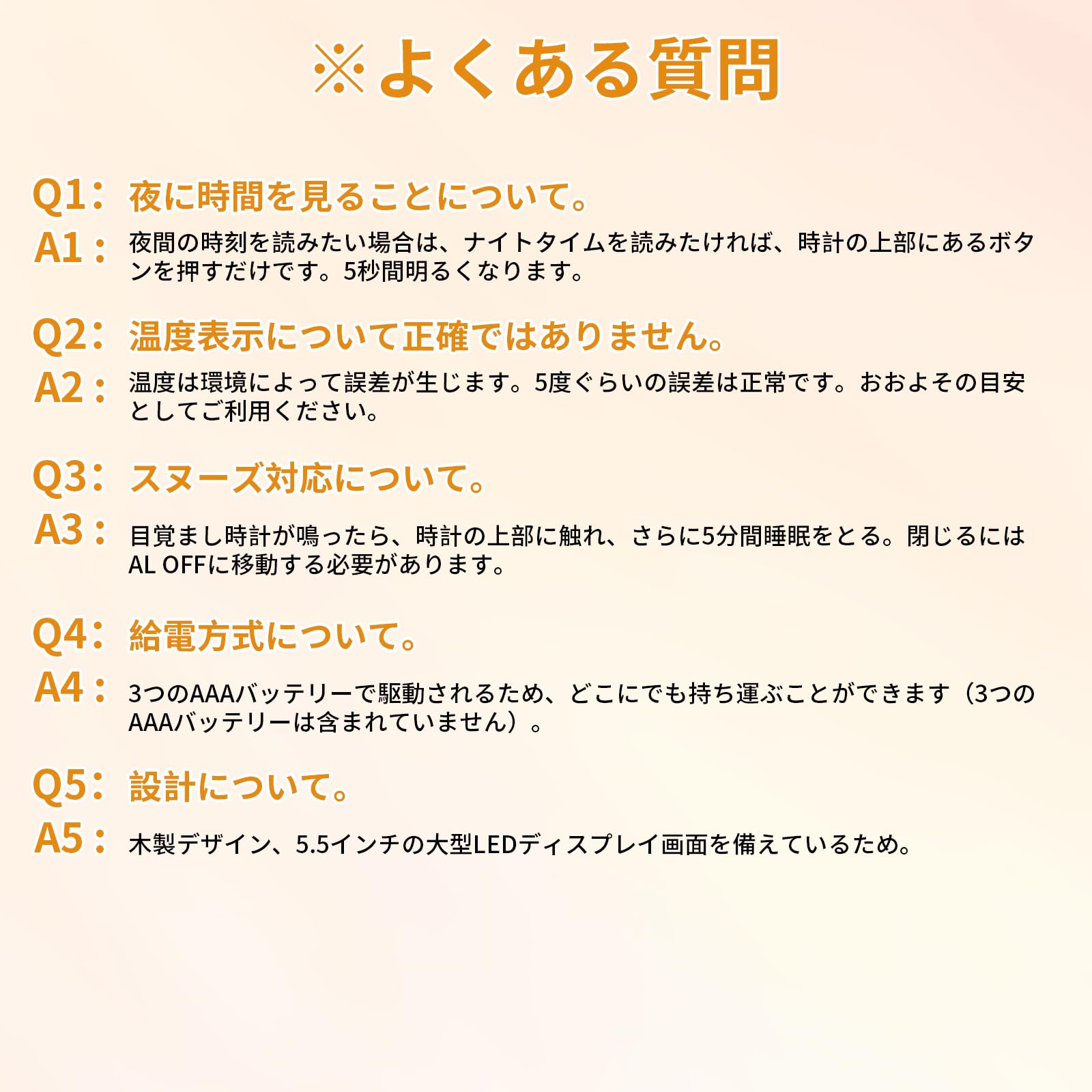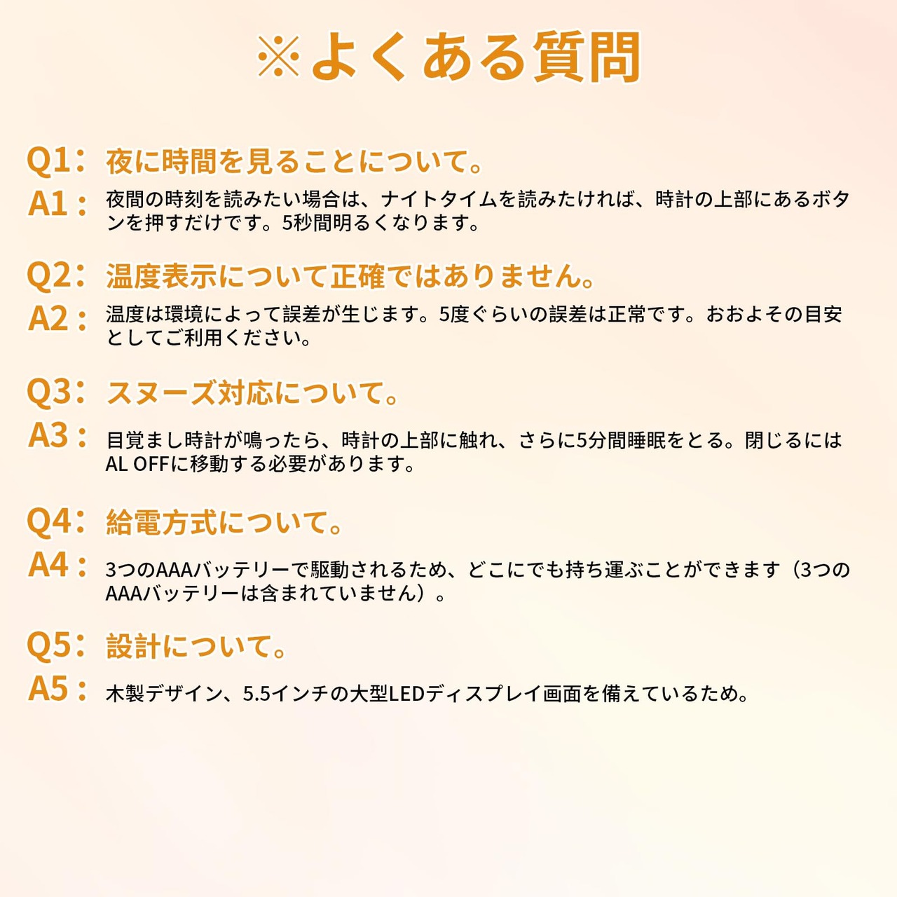 スヌーズ対応-目覚まし時計は、新鮮な一日を始めるのにさらに5分必要な人のためにスヌーズ機能を備えて設計されています。目覚ましが鳴ったら時計の上部をタッチすると、さらに5分間スリープ状態になります。最大3回スヌーズします。