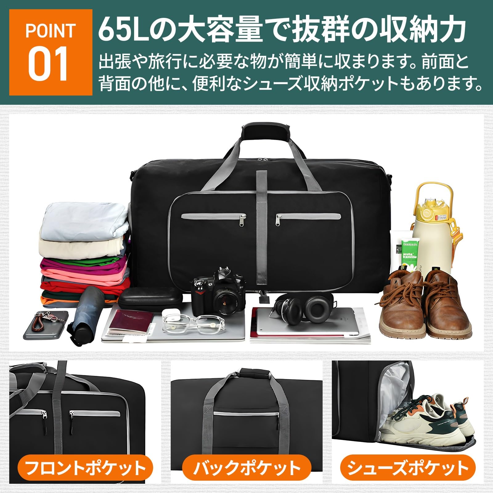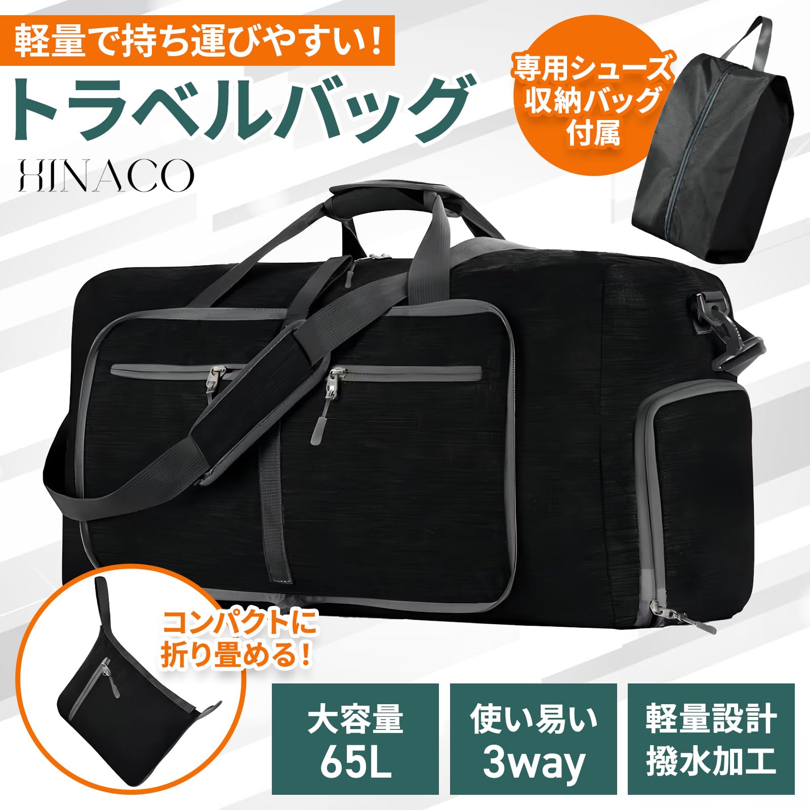【数量限】HINACO 旅行バッグ ジム用 トラベルバッグ 折りたたみ ボストンバッグ ダッフルバッグ キャリーオンバッグ 大容量 旅行カバン 65L 防水 シューズバッグ付き ロゴなし(グレー)
