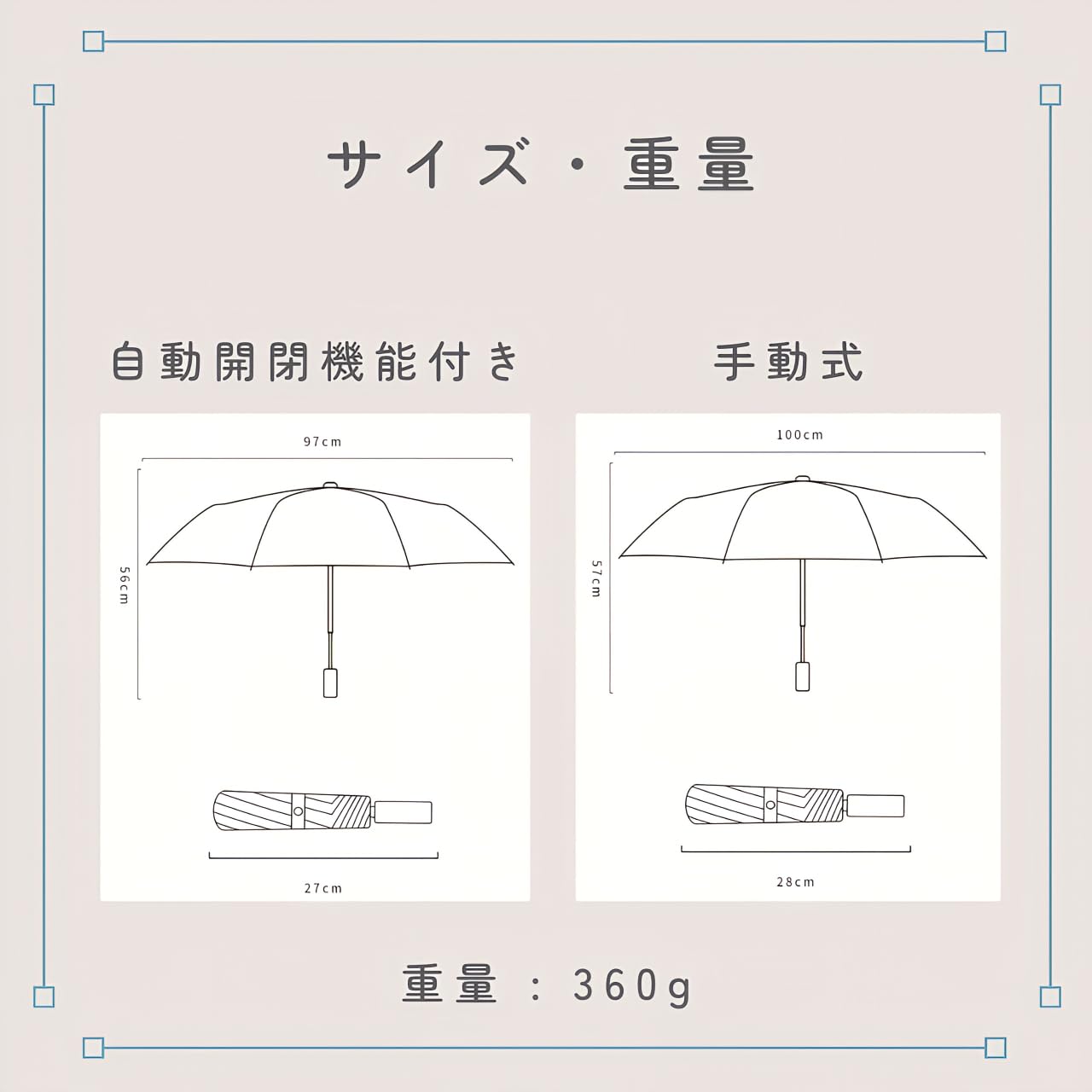 【サイズと重量】開いた状態では直径約100cmで大人2人でも十分にカバー可能。傘の高さは約57cm。広げた時の大きさは97〜100cm。収納時のサイズは約28cm。重さは約360gです。