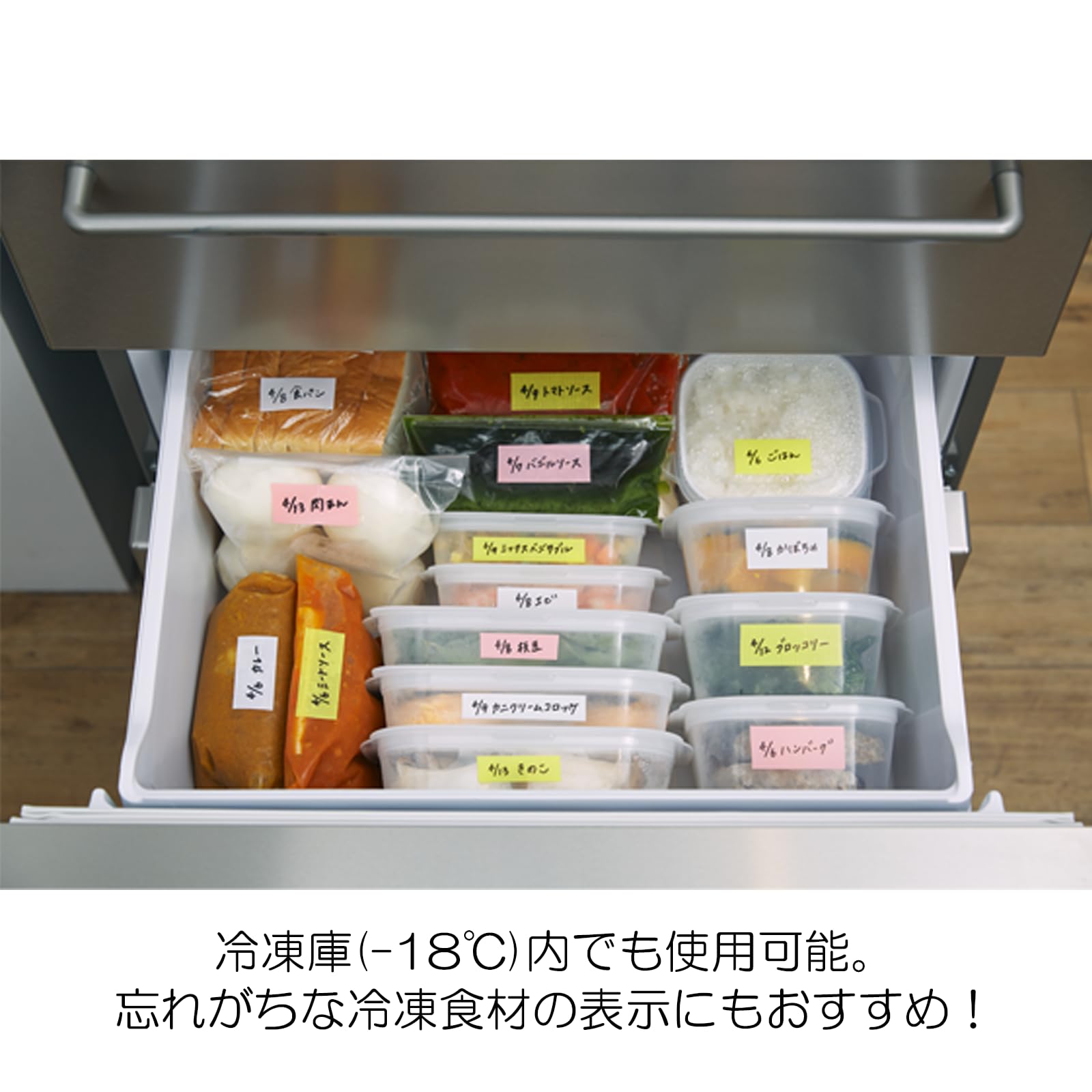 【冷凍・冷蔵保存にも】テープを貼ったまま冷蔵庫(4℃)、冷凍庫(-18℃)内で使用することができます。離乳食や介護食を小分けで保存する際のラベリングにもおすすめ。