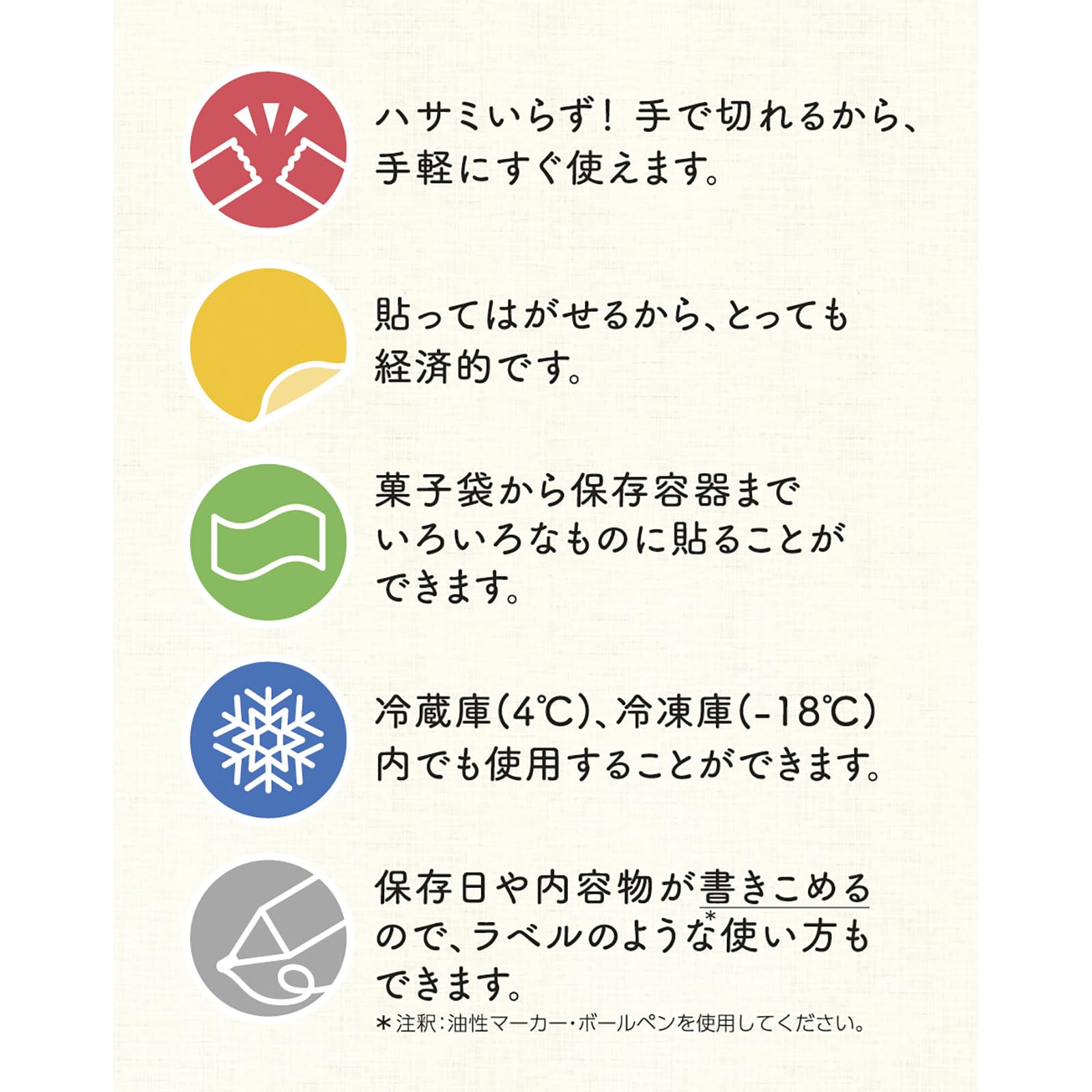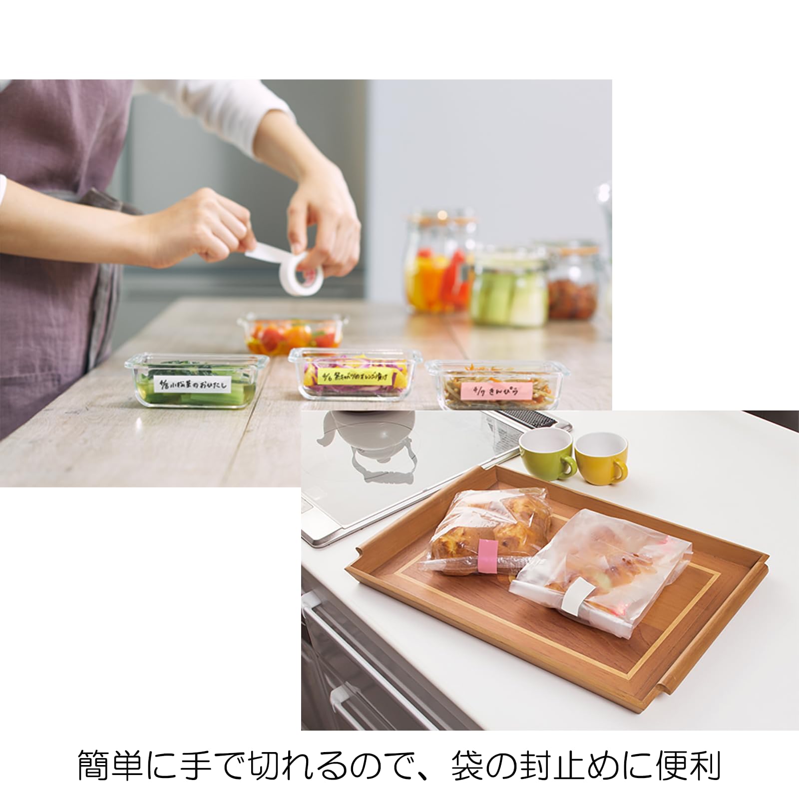 【食品ロスの削減に】テープの上に油性ペンで文字が書けます。日付や賞味期限を記入しておけば、ご家庭の「食品ロス」の削減に繋がります。