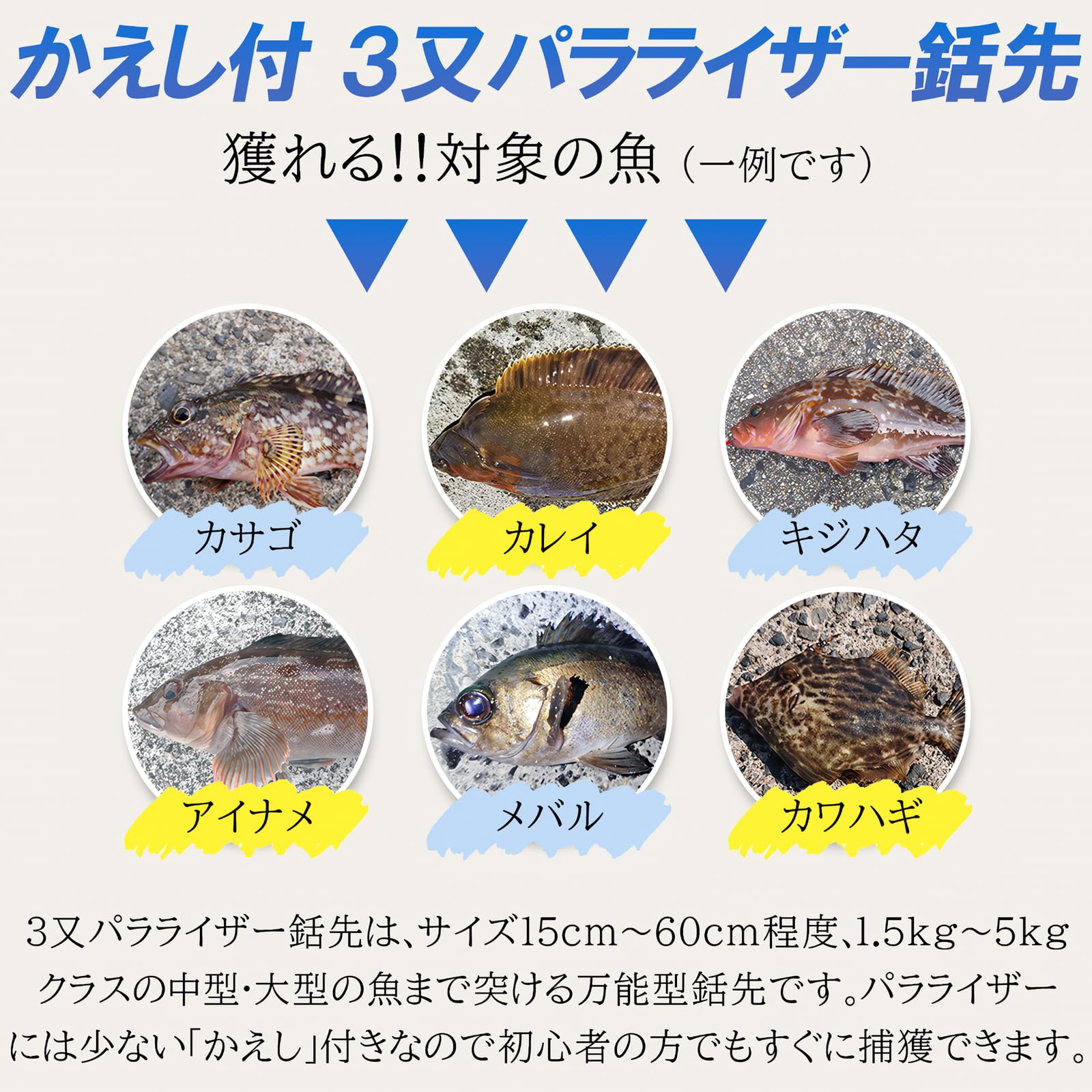 【主な魚】カサゴ、アイナメ、キジハタ、カワハギ、クエ、イシダイ、クロダイ、カレイ、スズキ、マダイ、イシダイ、クロダイ、メバル、メジナ、イカ、その他 【対象サイズ】15-60cm
