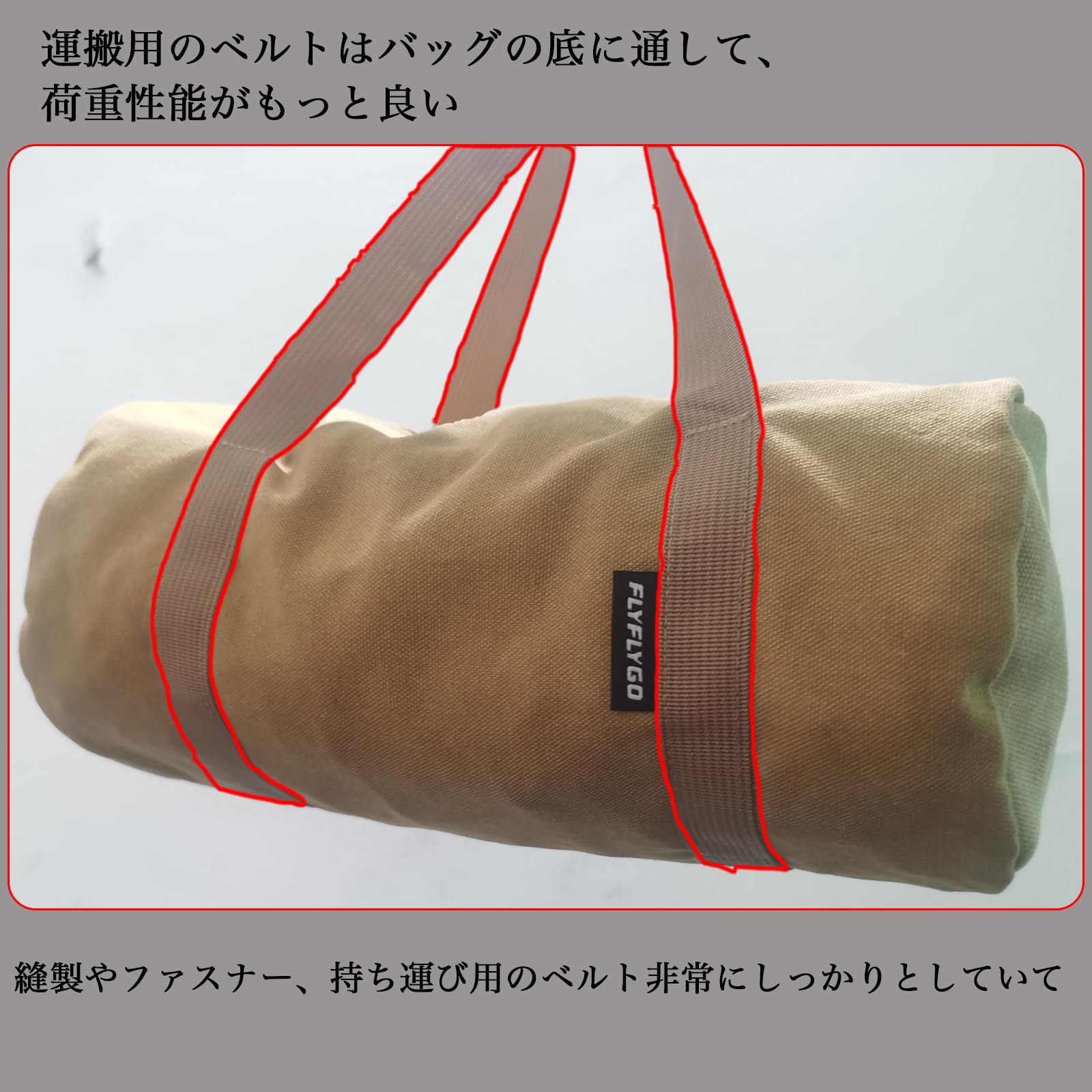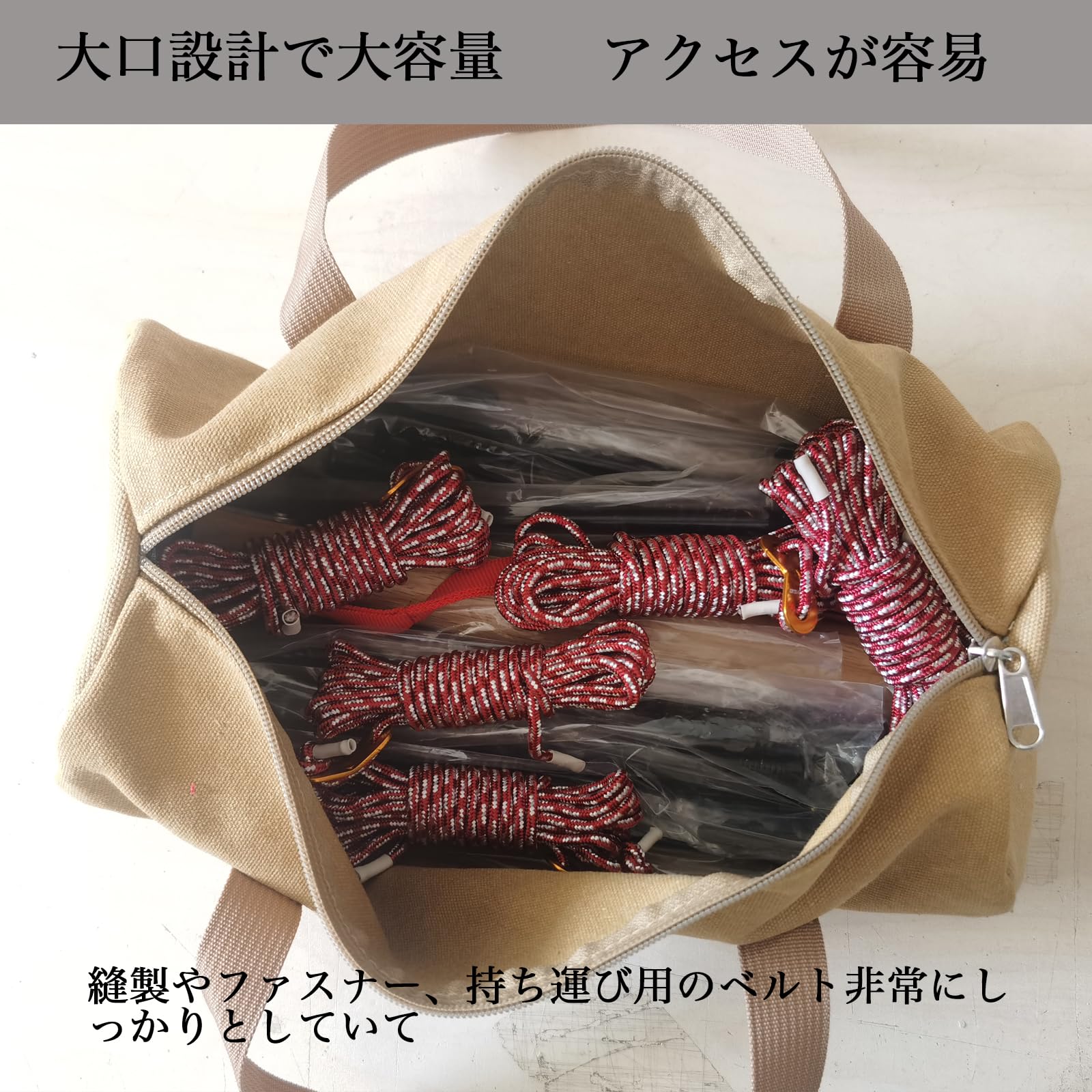 【商品特徴】①帆布製で厚みもあり丈夫、縫製やファスナー、持ち運び用のベルトも非常にしっかりです。 ②丈夫な二重構造生地:両サイドには突き抜け防止の二重構造になっています。 ③持ち運び用のベルトがペグバッグの底部を通っており、ペグケース全体を包み込むように設計されています。これにより、重すぎて裂けるのを防ぎます。 ④大口設計で出し入れがしやすいです。