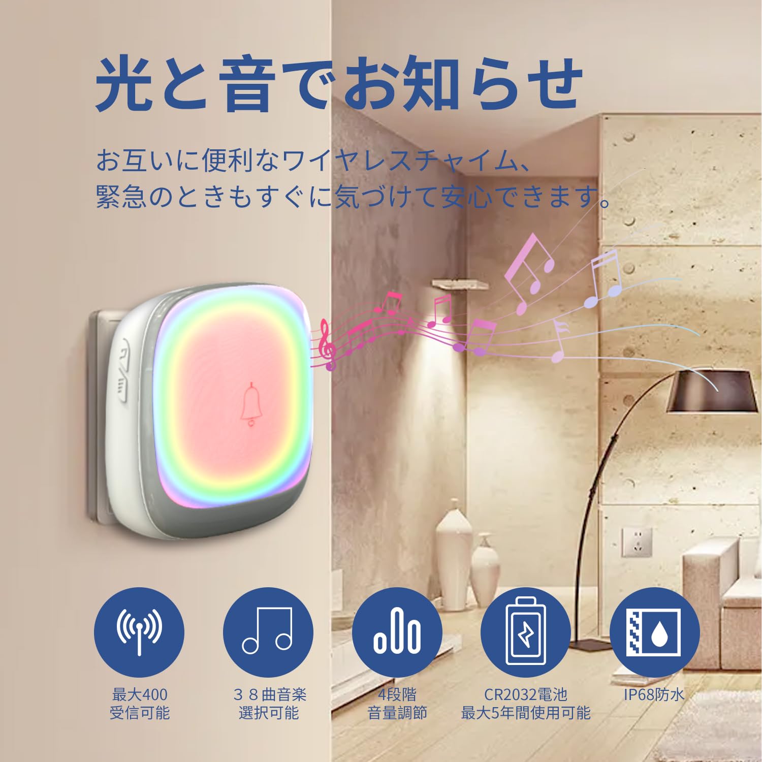【使用簡単】ボタンを押すだけで受信機から音が鳴ります。38曲のメロデイーを選択できて、必要に応じて、音量が25db〜110dbまで4段階で調節可能です。お子供と年寄りの方も使用できます。 いろんな環境と要求を満足できます。