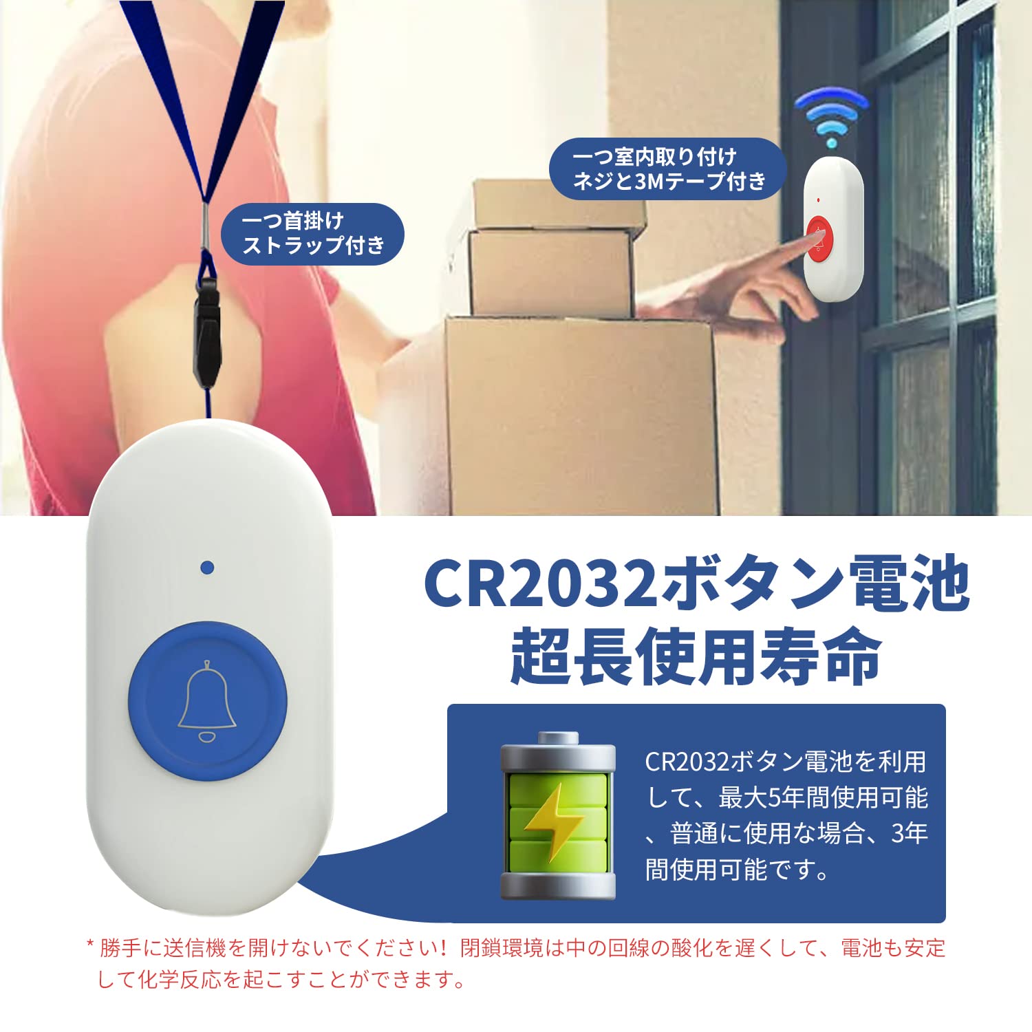 【緊急連絡呼び鈴】 この呼び鈴は高齢者や障害者のために設計されており、緊急時に助けを求め、救助時間を節約します。ご不便な時、コールボタンを押して介護者/家族にSOS信号を発信できる緊急連絡ベルです。老人、妊婦、患者に最適です。
