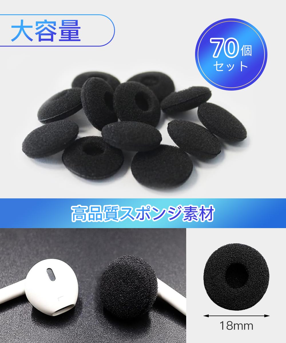 【セット内容】イヤークッション70個セット、サイズ:18mm、カラー:ブラック。