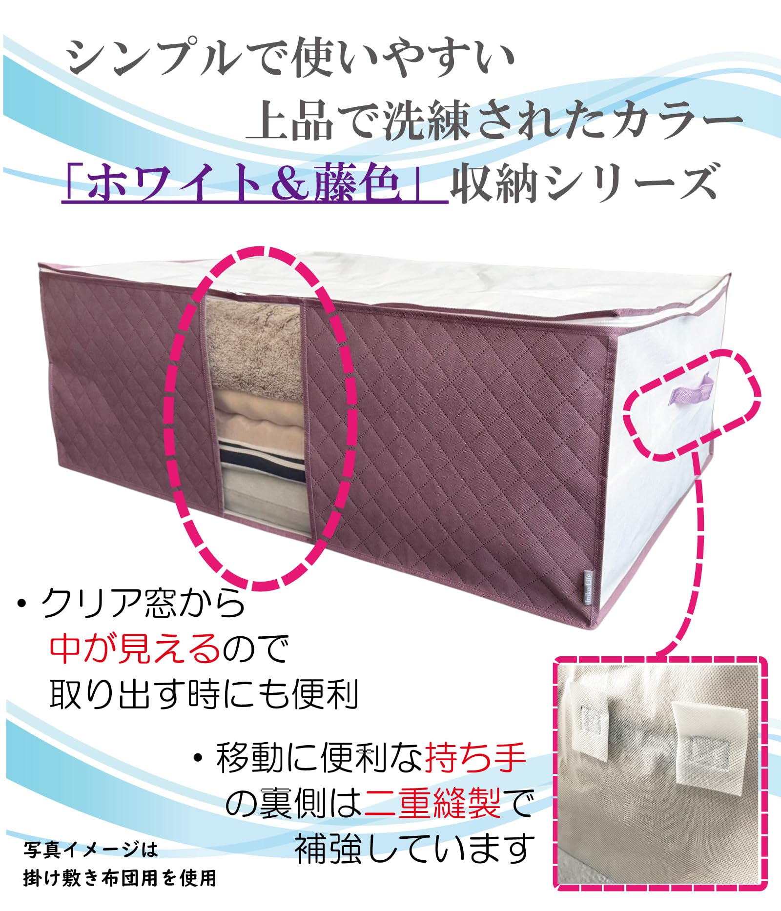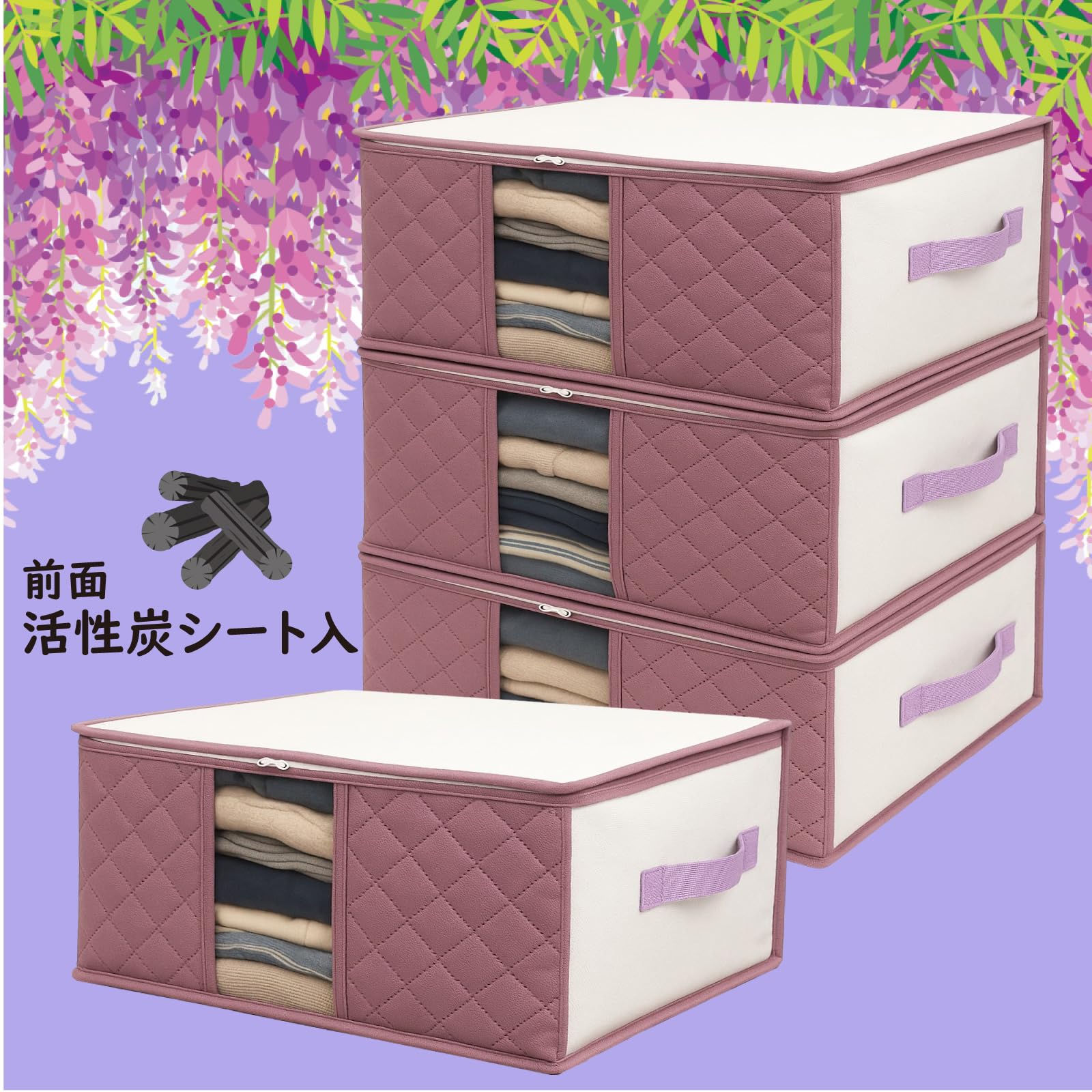 【商品仕様】サイズ/約幅50×奥行35×高さ20cm カラー/ホワイトx藤色 内容/4個 収納目安(ケース1枚あたり)/Tシャツ/薄手シャツ類 約15-25枚トレーナー/厚手セーター類 約4-6枚 材質/ポリプロピレン不織布・活性炭・ポリエチレン 生産/中国 洗えません