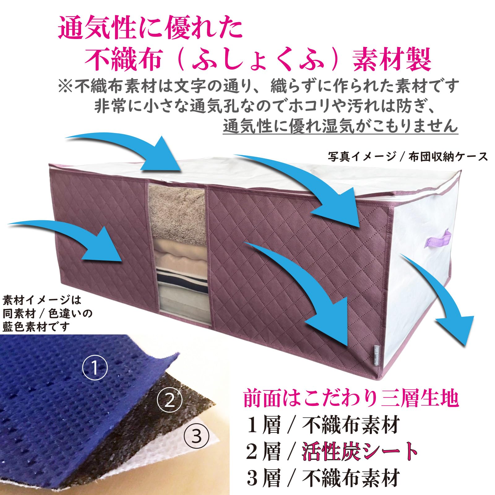 【通気性の良い 衣類収納ケース】通気性の良い厚手の不織布素材/前面には活性炭シートもプラス。衣類や小物をにおいやホコリ、汚れからしっかりガード。大切なものを清潔に、やさしく保管します。