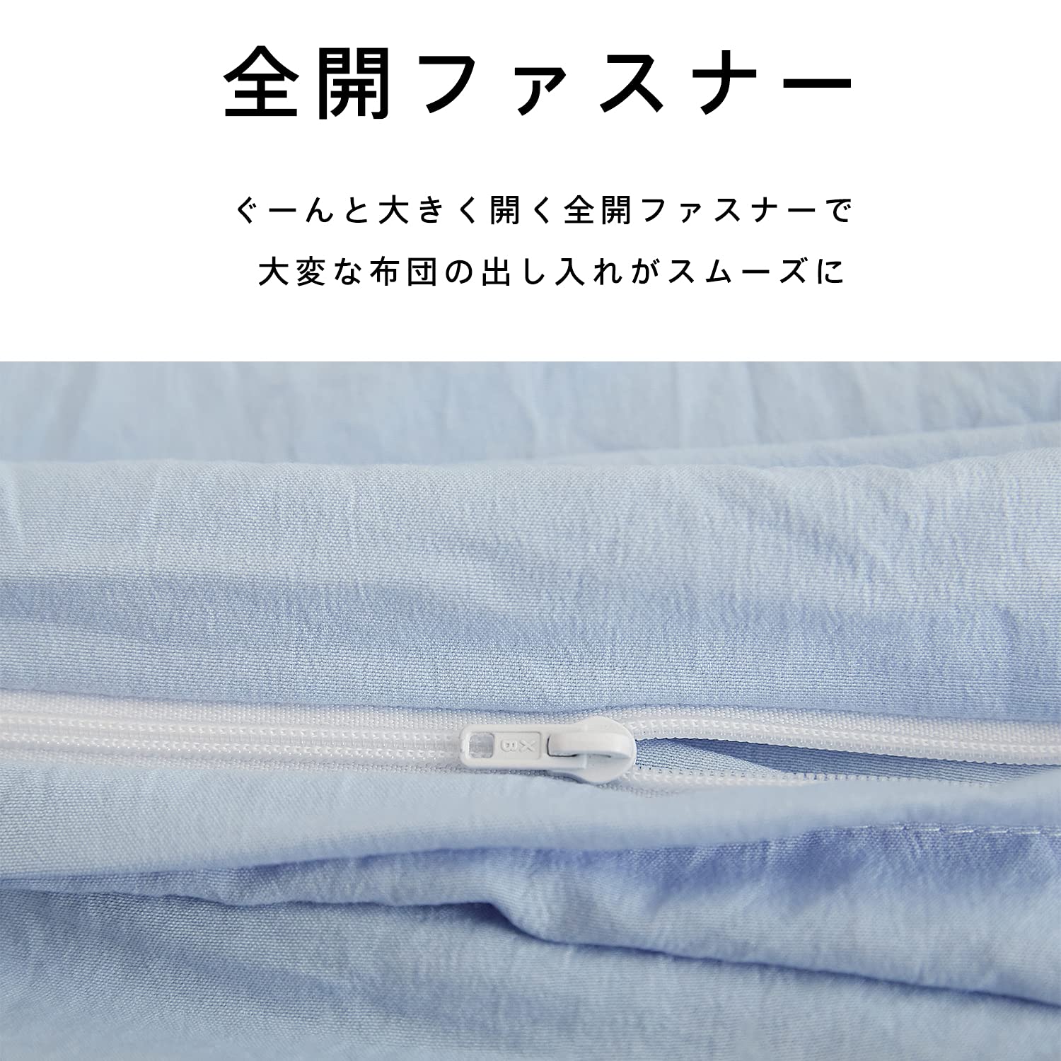 片側側面の全開ファスナーにより布団の出し入れが簡単に!
